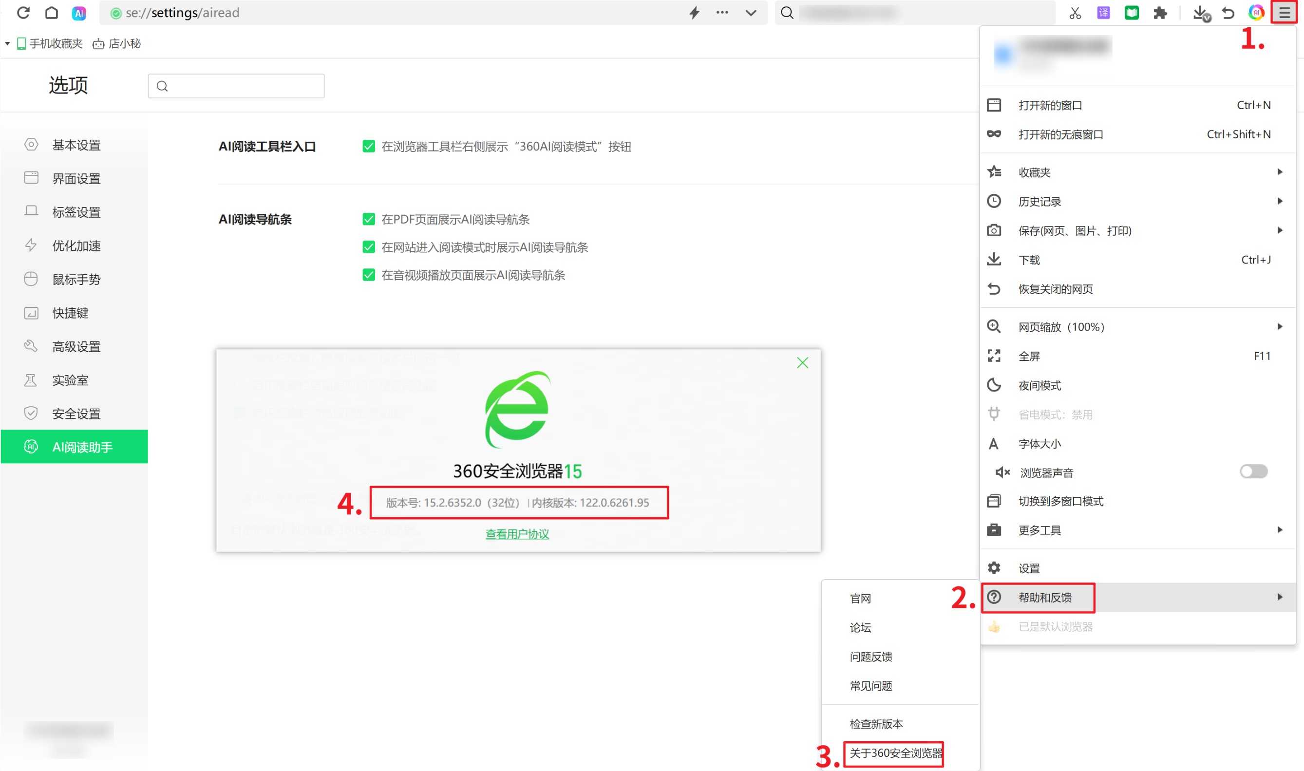 到【设置—帮助和反馈—360安全浏览器,可以查看版本(内核版本低于88)—点击检查新版本,一键升级即可】