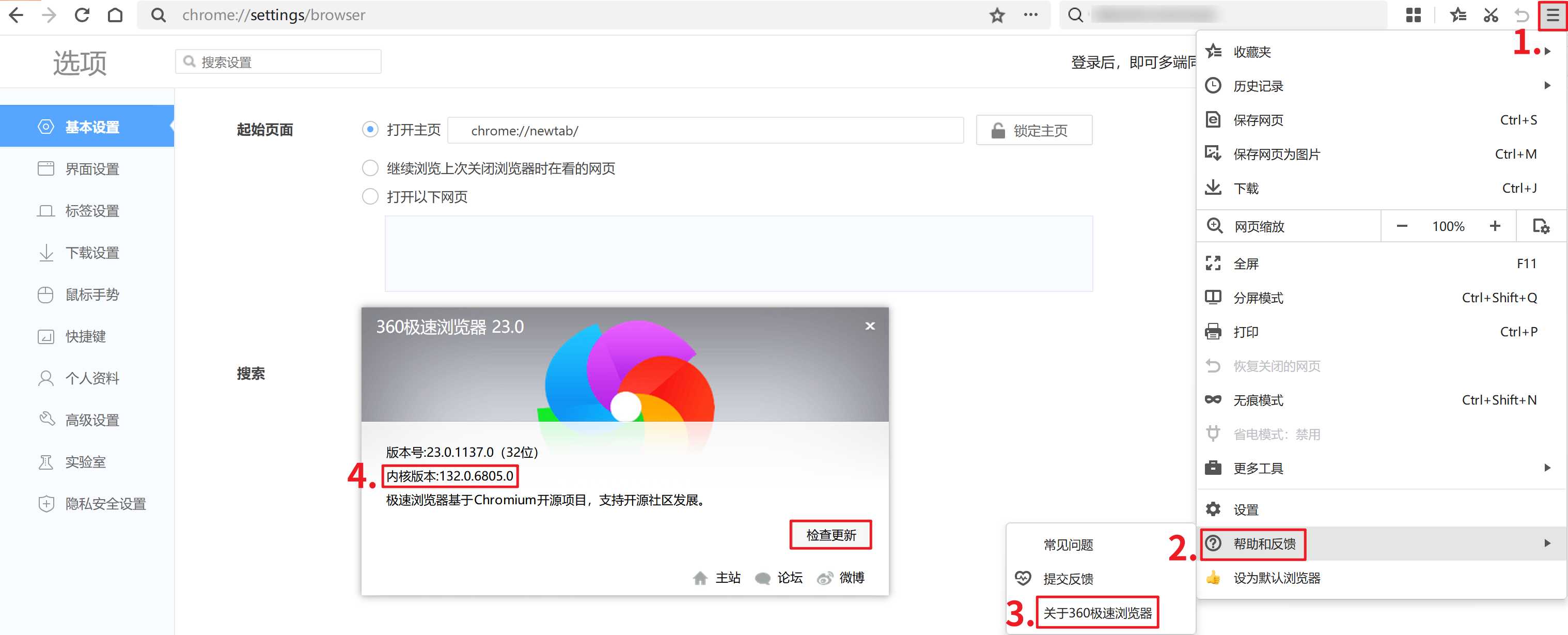 到【设置—帮助和反馈—关于360极速浏览器—查看内核版本(若低于88需升级)点检查更新即可】