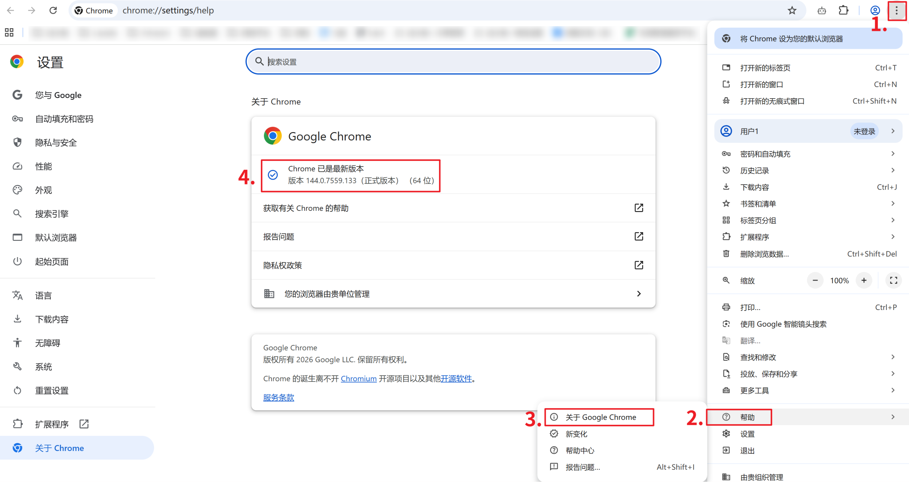 到【设置—帮助—关于Google Chorme—查看浏览器版本(若低于88需升级)】