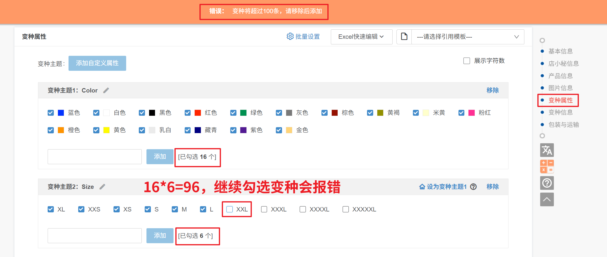 2、变种数量取得是 变种主题1的勾选数量 * 变种主题2的勾选数量,如果勾选变种数量乘积超过100,无法继续勾选变种,