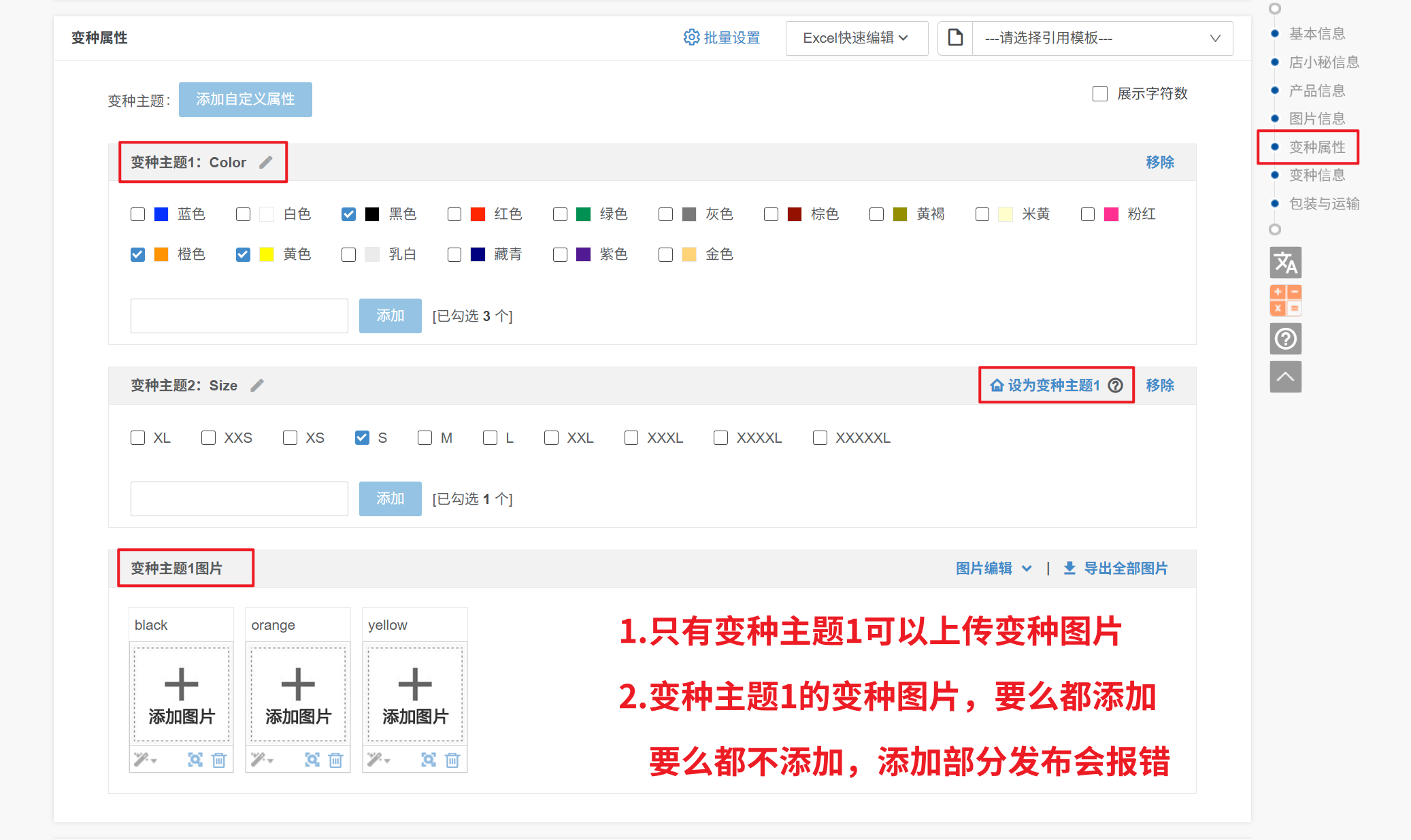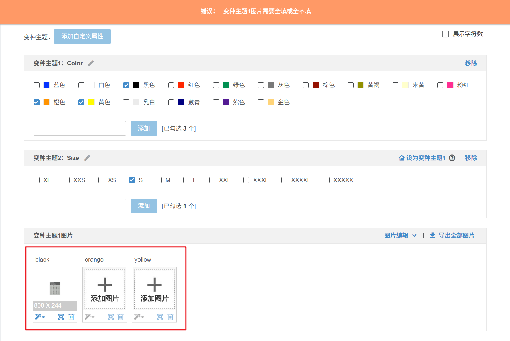 2.如第一个变种主题是颜色,有红色和绿色两个变种属性,必须两个变种属性都加图片或者都不加,不可添加部分,和Shopee后台一致