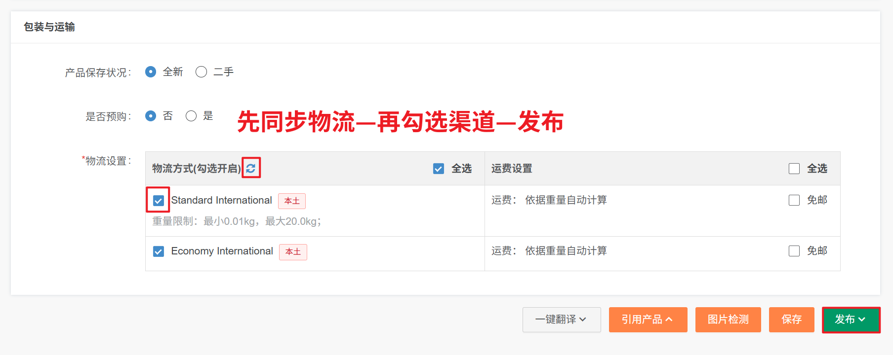 原因:选择的物流方式有问题,其中一个或者多个物流方式对某些分类禁用了,需要更改下物流方式解决方案:1、产品编辑页,物流设置—同步物流—再勾选渠道—发布2、产品编辑页面下包装与运输,standard这个物流方式去掉勾选或者切换取消勾选其他的物流方式,再发布3、如果店铺后台只有一个物流方式 ,那说明卖家不能刊登该类目4、到Shopee后台,选择相同分类的产品,发布,看下物流方式,哪个不能选的(页面会有直接提示),再到小秘页面取消勾选后,再发布哈Shopee店铺后台物流方式显示
