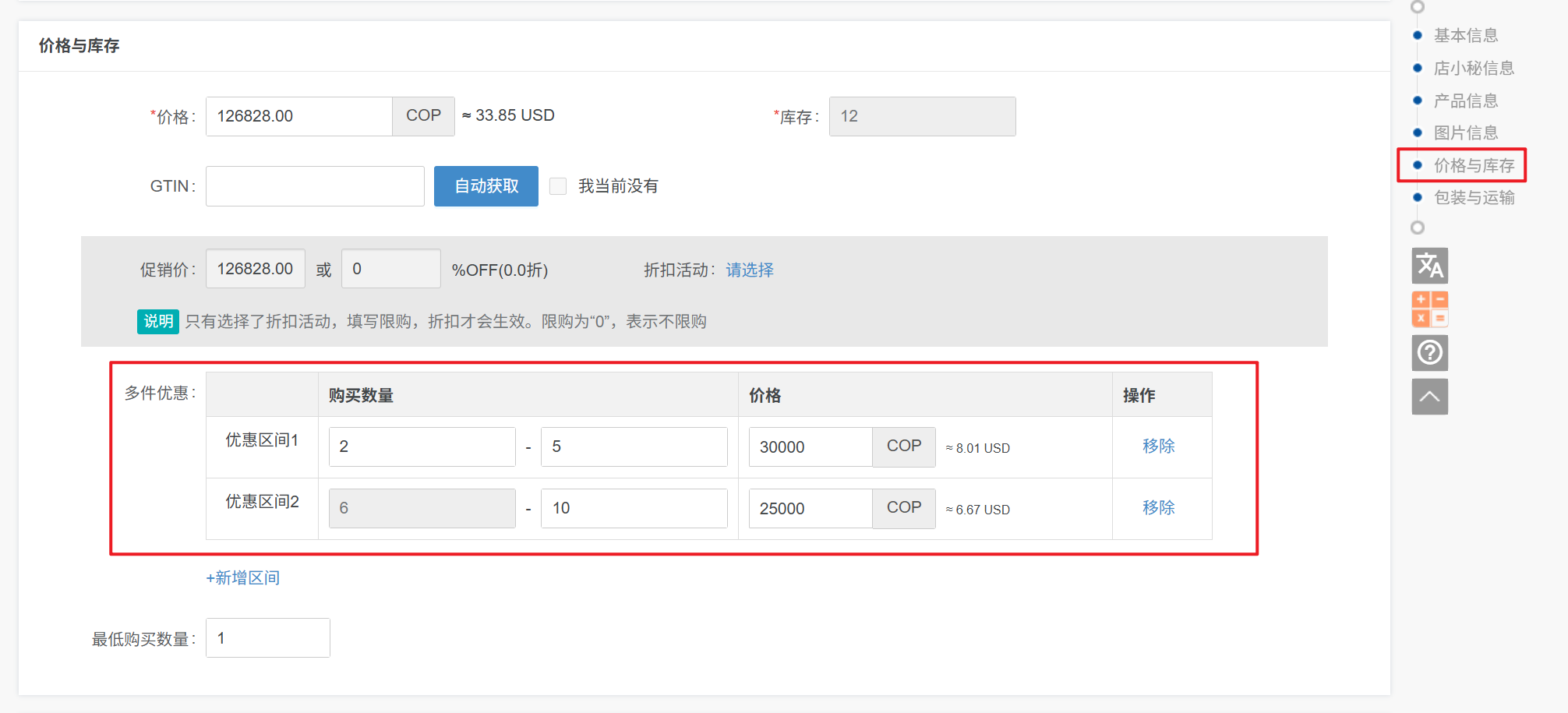 产品编辑页面,移除设置的多件优惠后,再发布即可