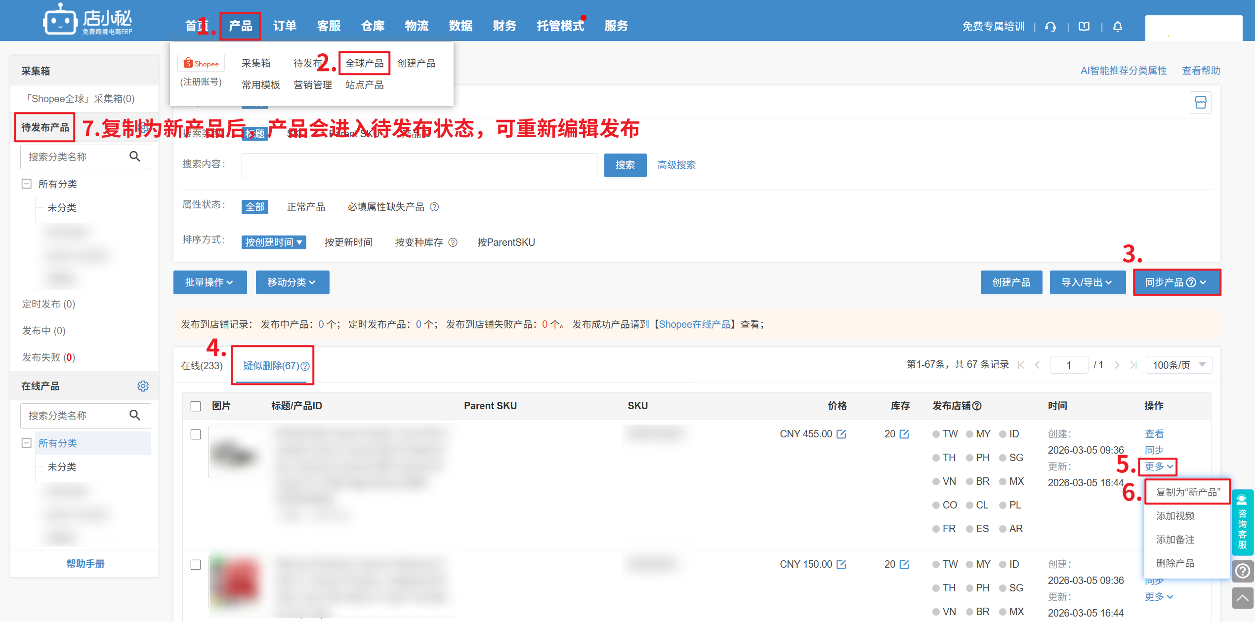 先同步全球在线产品,若显示在疑似删除状态下,代表产品有被删除过了,只能复制为新产品重新发布,再发布至站点店铺