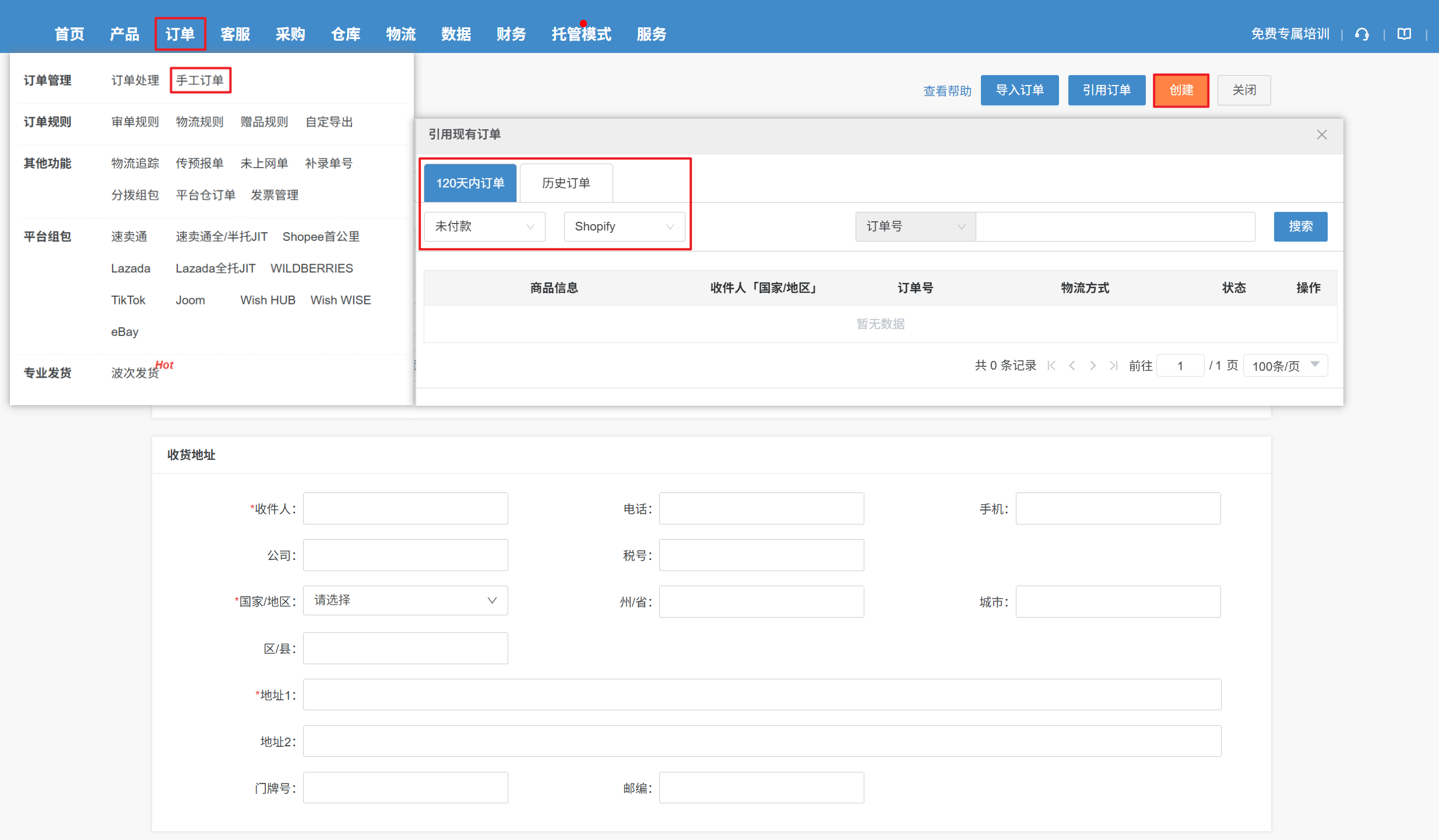 第一步:【订单—手工订单—引用订单—选择未付款和Shopify—引用—创建】