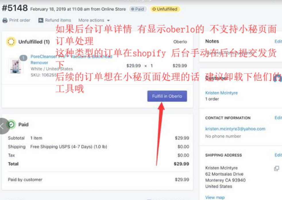 若Shopify店铺后台订单详情有显示Oberlo的,这样的订单不支持在小秘页面处理