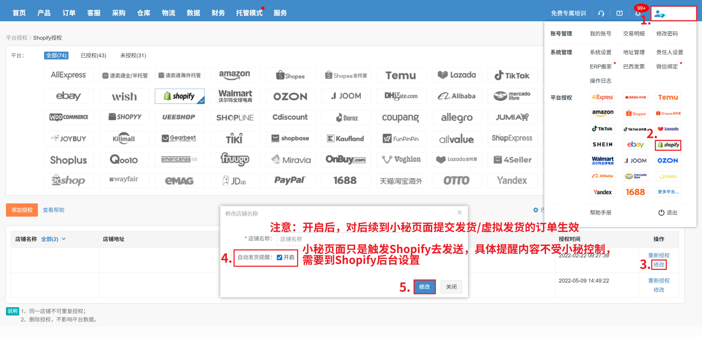 【用户名—平台授权—Shopify—找到对应店铺—修改—勾选开启“自动发货提醒”—修改即可】