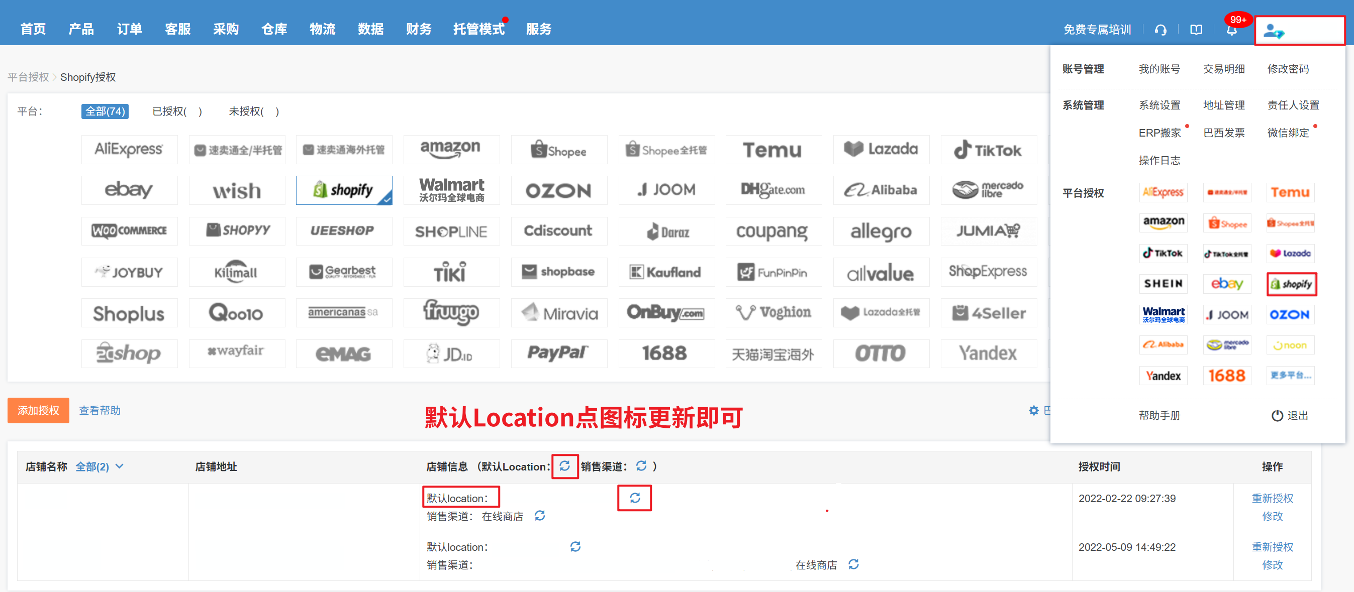 【用户名—平台授权—点击Shopify—默认Location—点击图标更新即可】