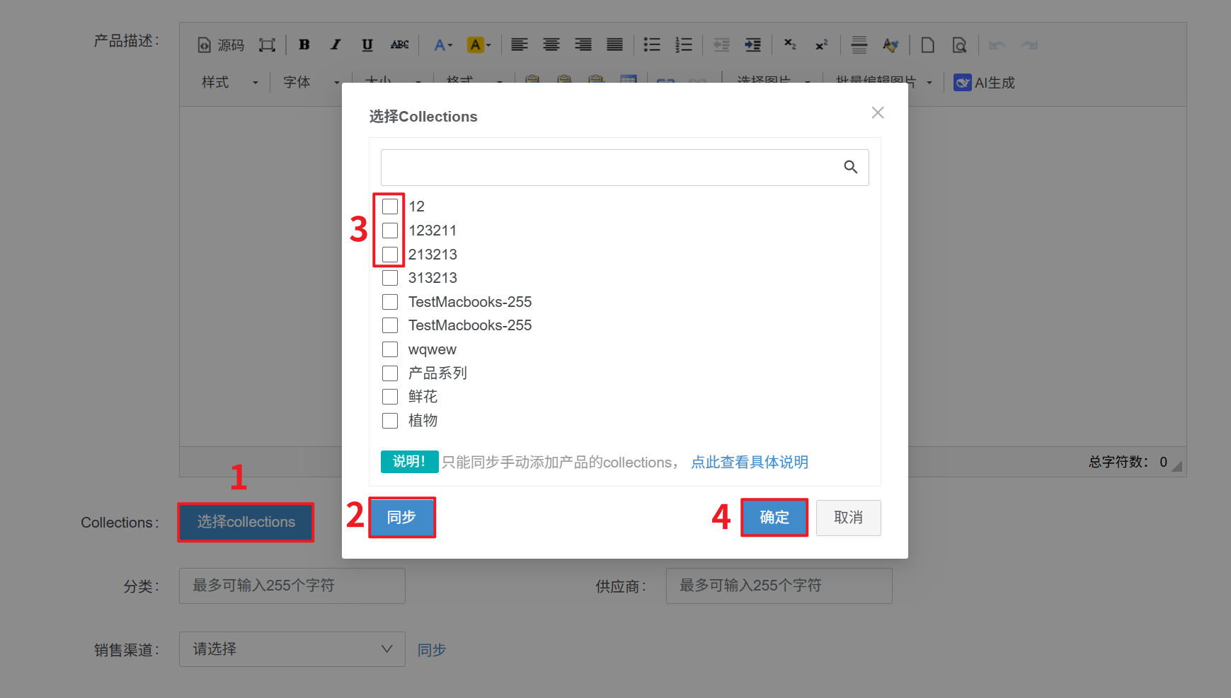 在产品编辑页面选择Collections,【同步—选择—确定】即可