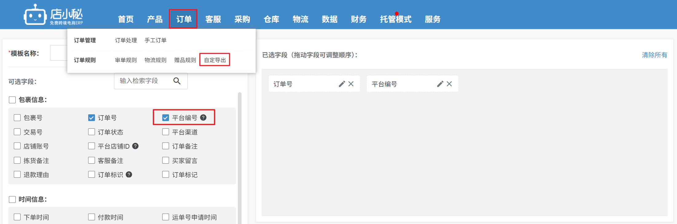 A3:可以到【订单—自定导出—导出模板选择订单号、平台编号—保存】,导出订单选择保存的模板,导出下载表格对照查看