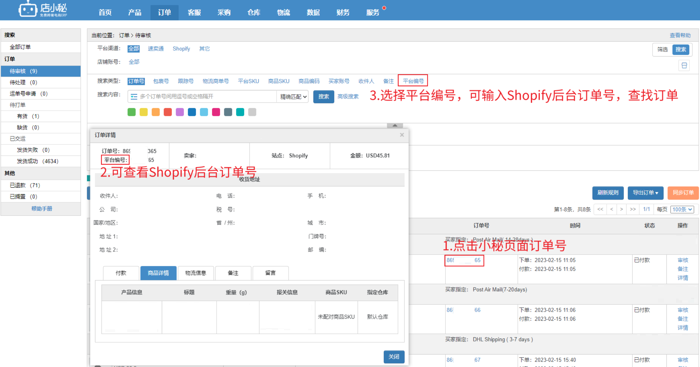 Q2:如何通过Shopify后台订单号,到小秘页面查找订单?