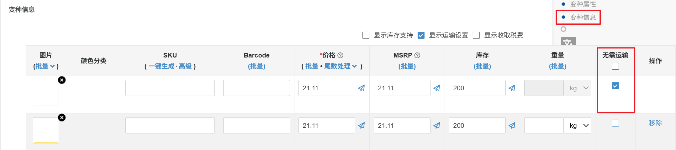 产品变种信息勾选了无需运输,默认不用填写重量