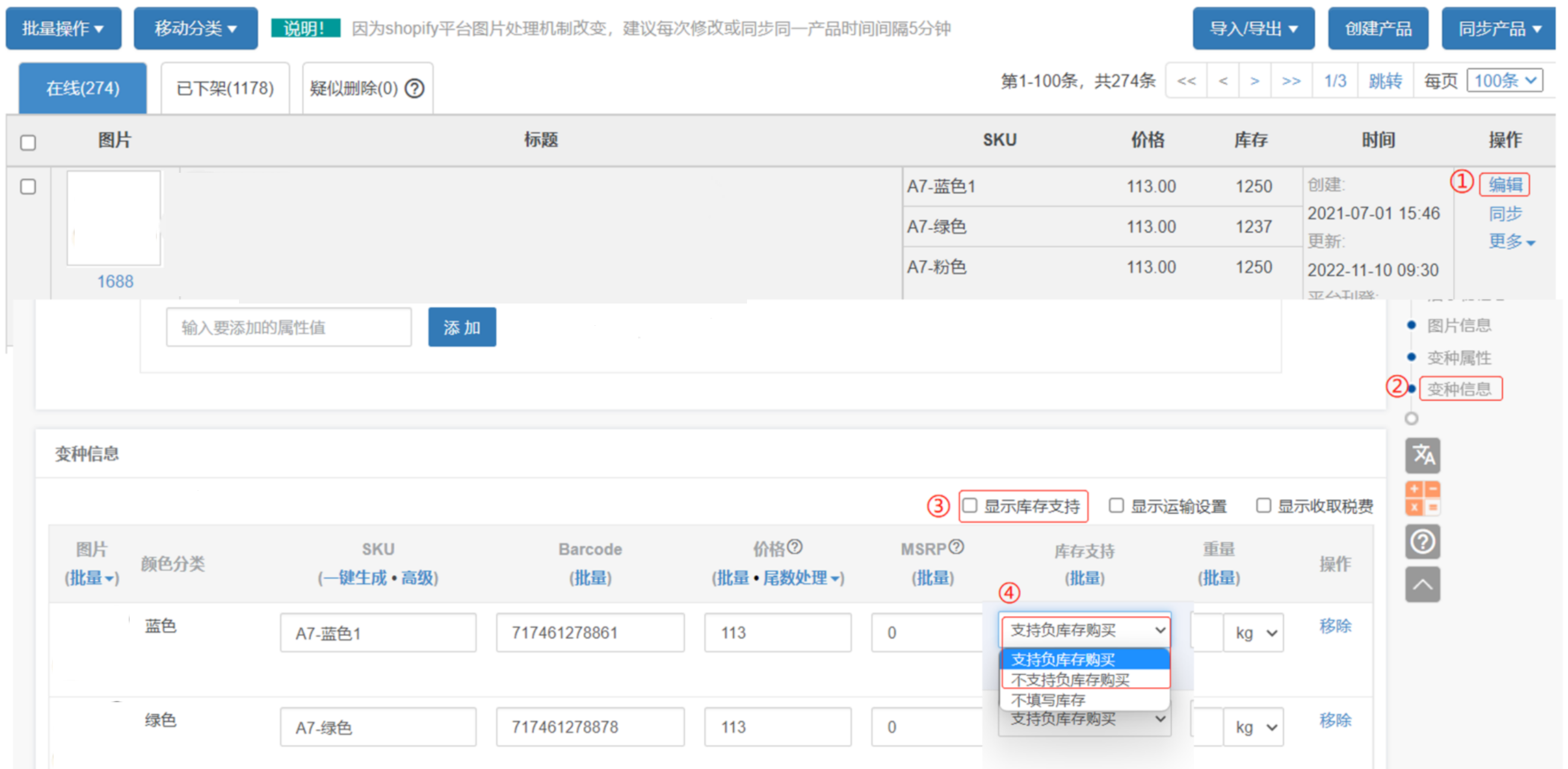 产品点击编辑-进到编辑页面-变种信息-勾选显示库存支持-下拉选其他两个选项即可