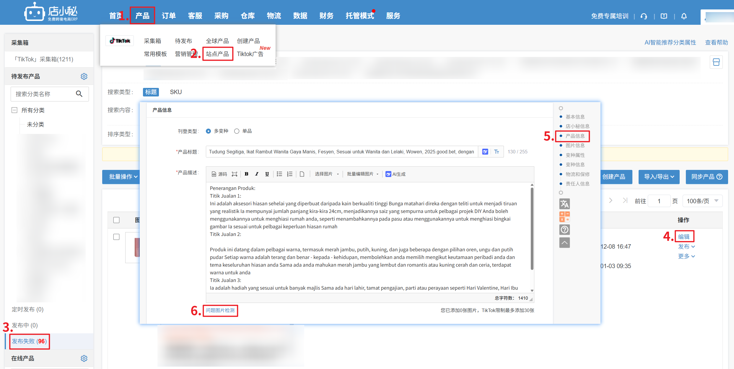 解决方案:【发布失败点击编辑—右侧点击产品信息—产品描述—问题图片检测—把检测出的无效图片删除再发布】