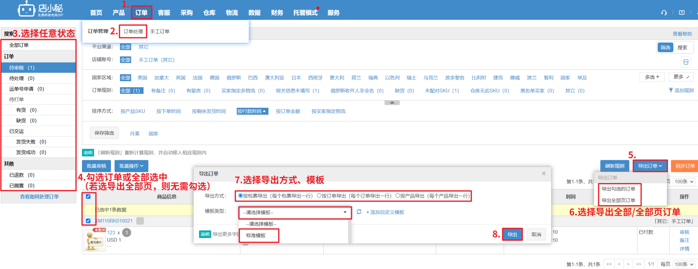 【订单任意状态—勾选订单—导出订单—选择导出勾选订单—选择导出方式—模板类型选择“标准模板”—勾选订单标识字段