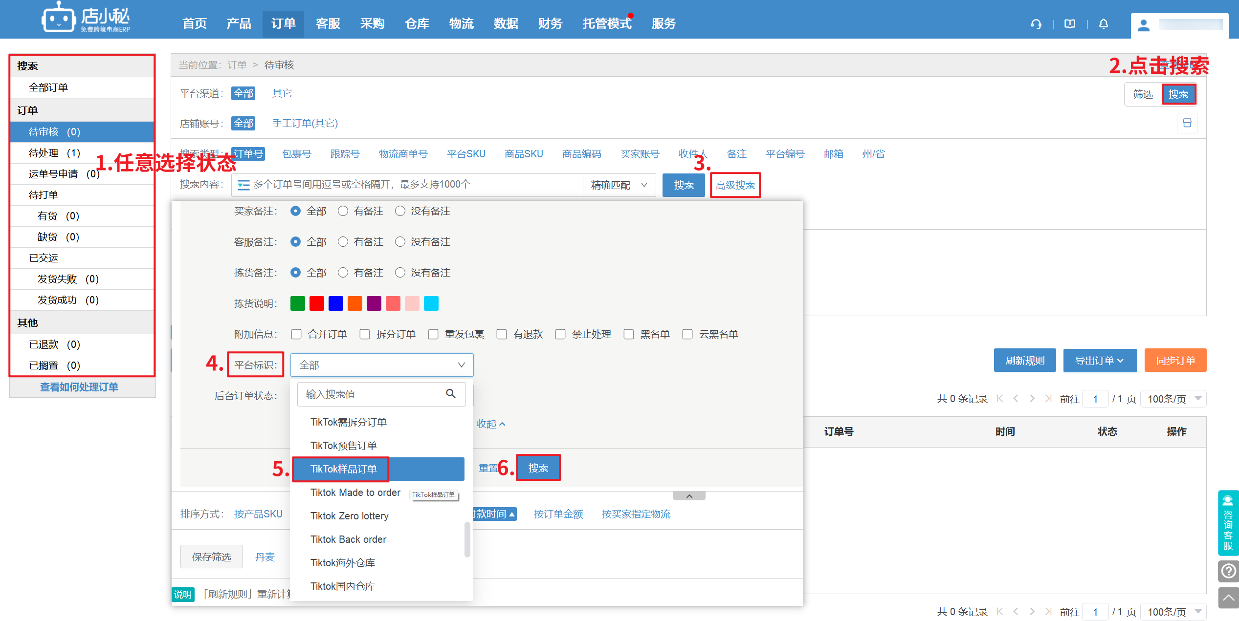 【订单任意状态—搜索—高级搜索—平台标识—下拉选择“TikTok样品订单”—确定】