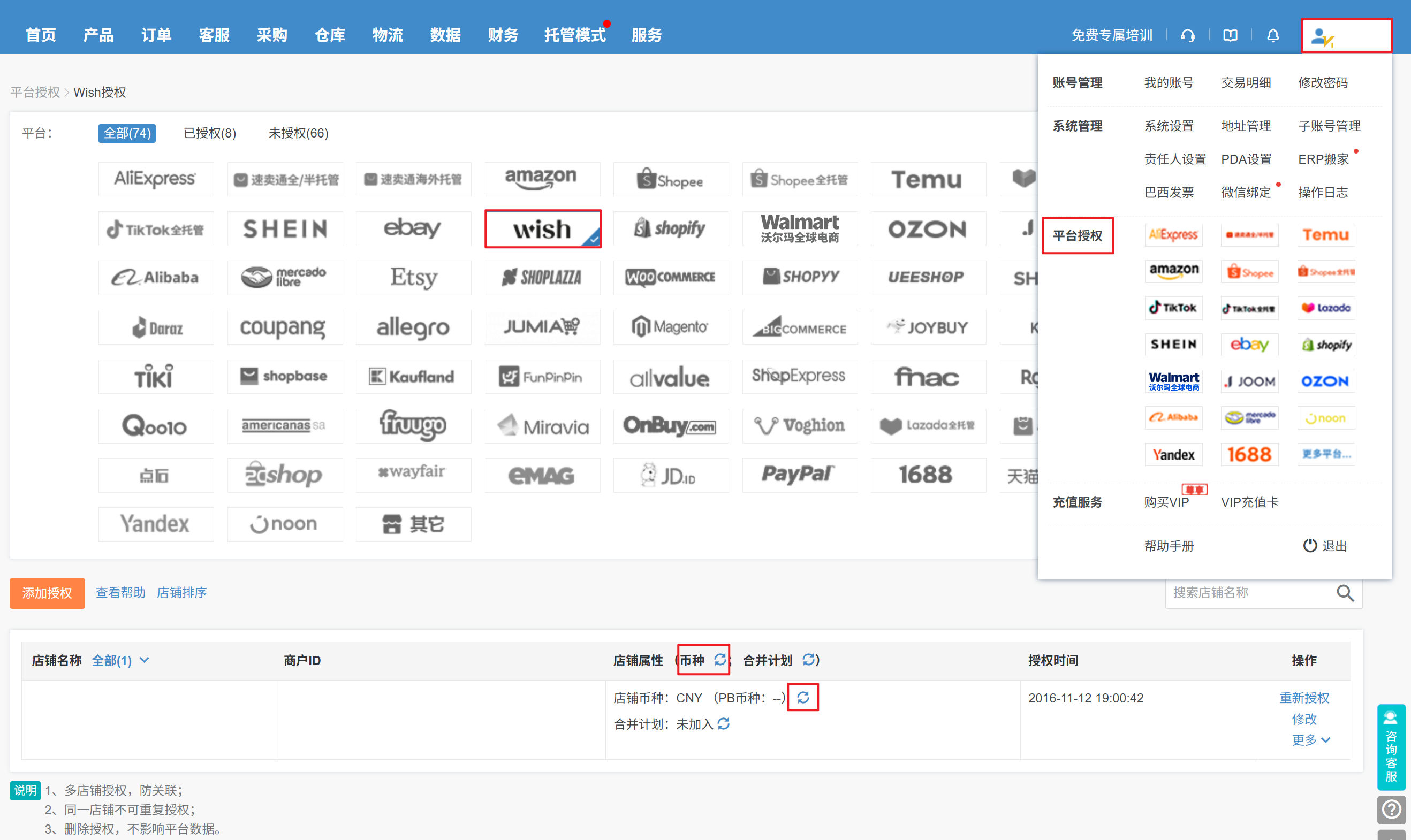 1、店铺币种是USD和CNY币种到【用户名—平台授权—点击Wish平台图标,找到对应店铺—更新币种】发布试试