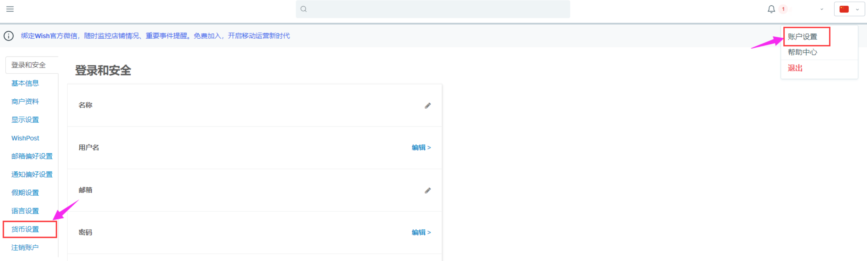 Wish后台查看币种路径如图: