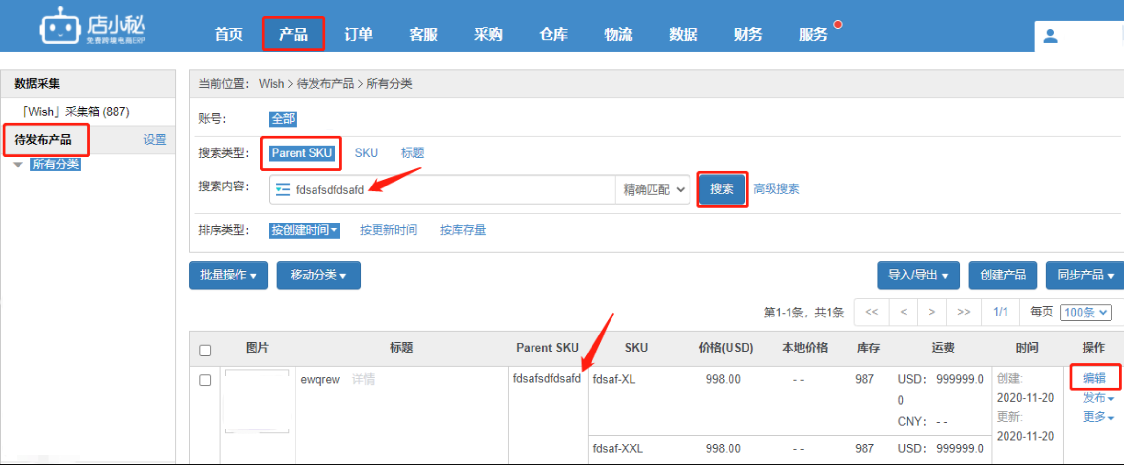 1、核实Wish后台是不是存在ParentSKU相同,但是大小写不同的产品,小秘页面不区分大小写,这种情况下,只能同步到一个2、小秘页面【产品 —待发布】下 是否存在相同ParentSKU的产品,可以通过搜索下,如果存在,只能删除或者更改待发布 ParentSKU 后,再点击同步产品