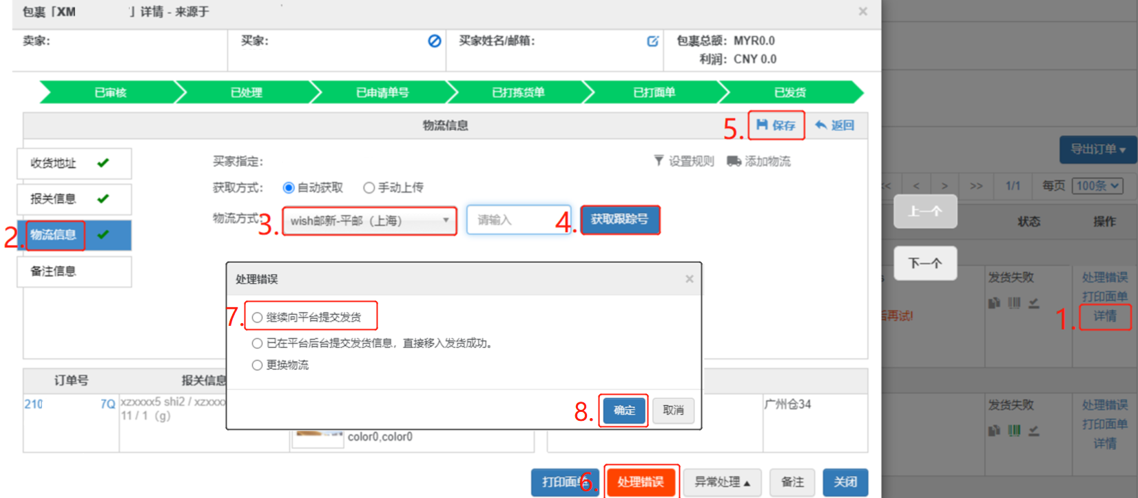 2、【点击处理错误—继续向平台提交发货——确定即可】