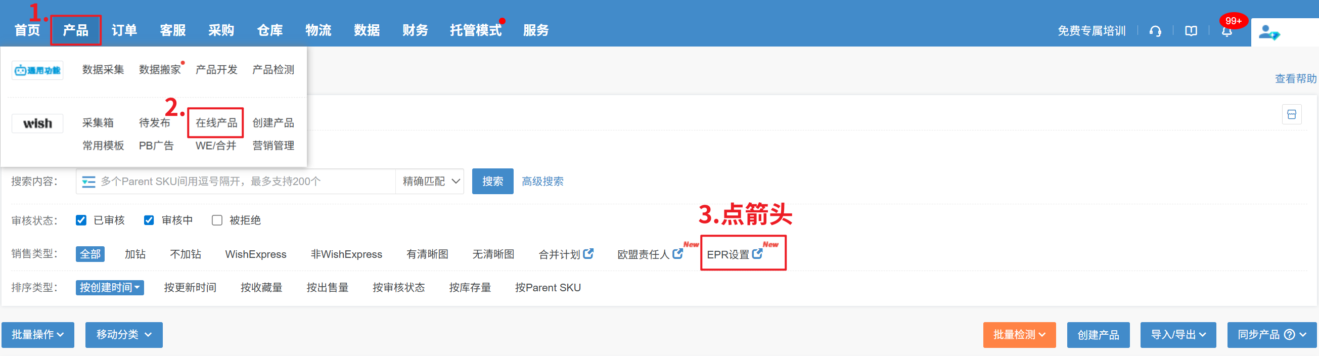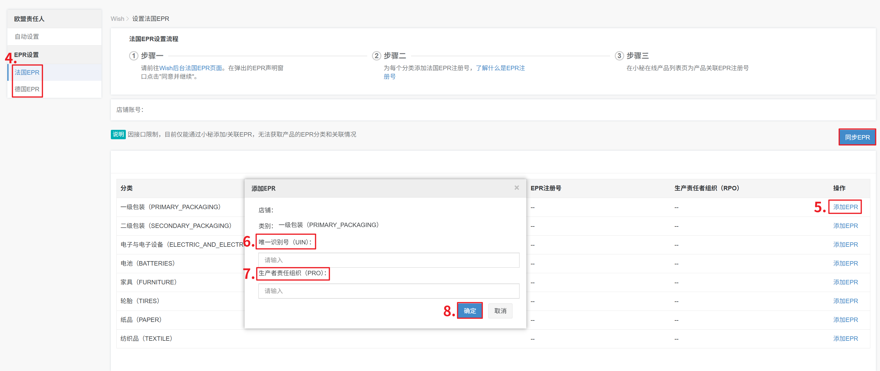 注意:如果您在Wish后台针对EPR分类添加了EPR注册号,可以直接点击同步EPR,将EPR同步到店小秘