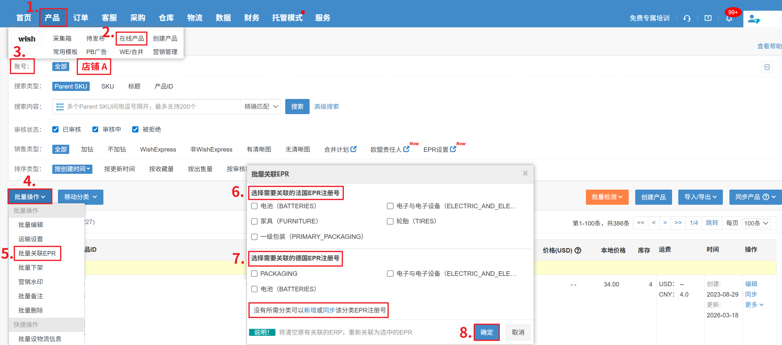 第三步:【产品—在线产品—选择店铺—勾选产品—批量操作—批量关联EPR—选择需要关联的法国/德国EPR注册号—确定】