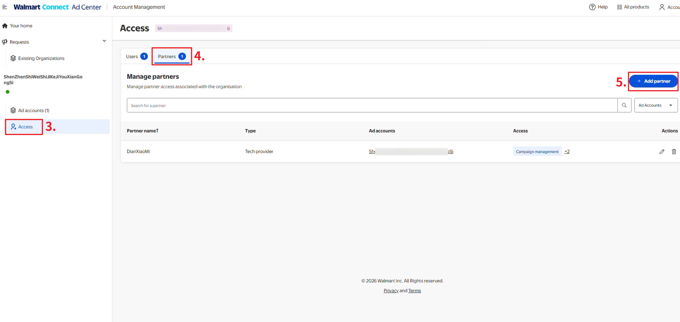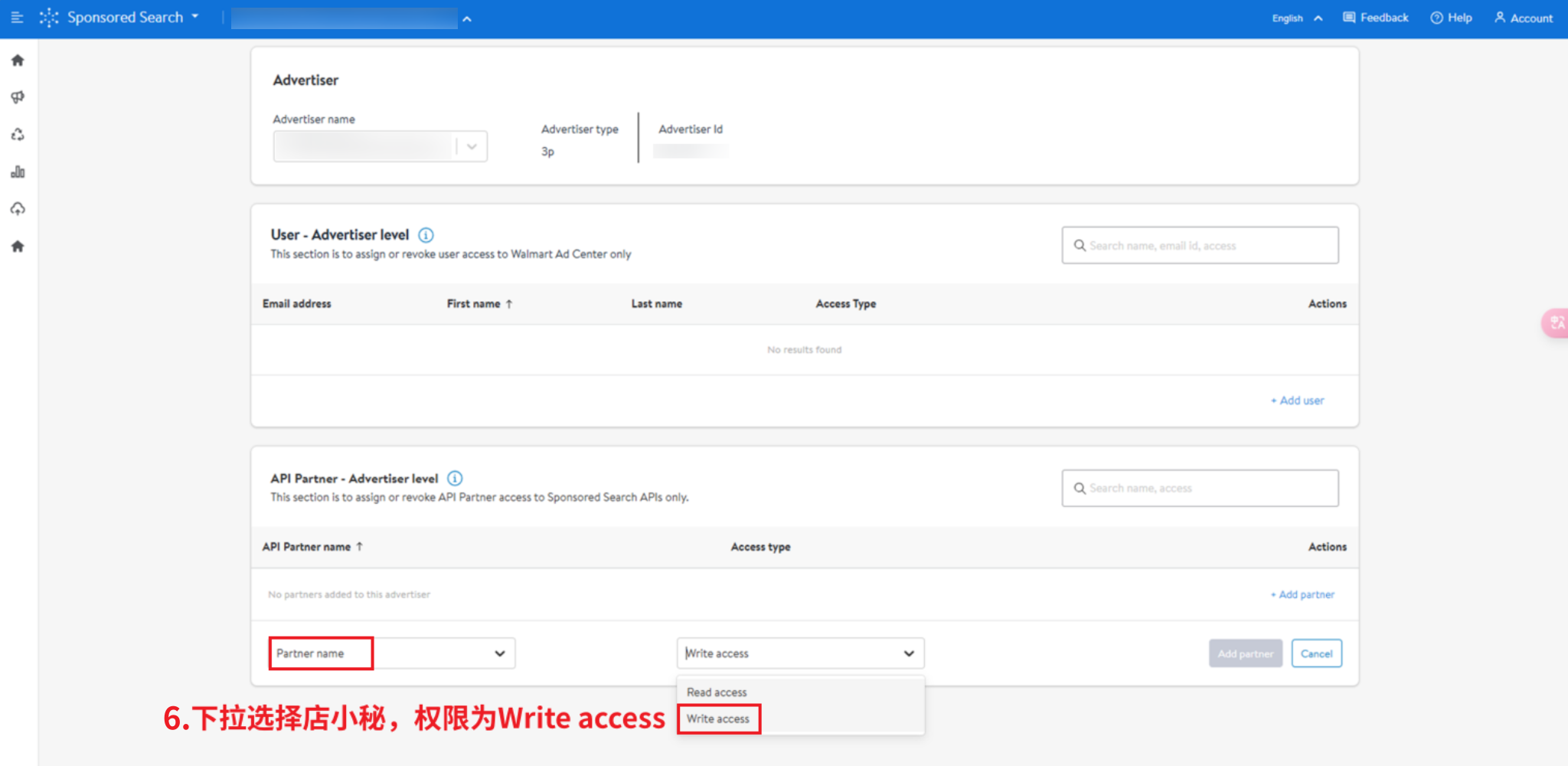 第二步:【点击Access—选择Partner—点击Add Partner——下拉选择DianXiaoMi—选择Write access】