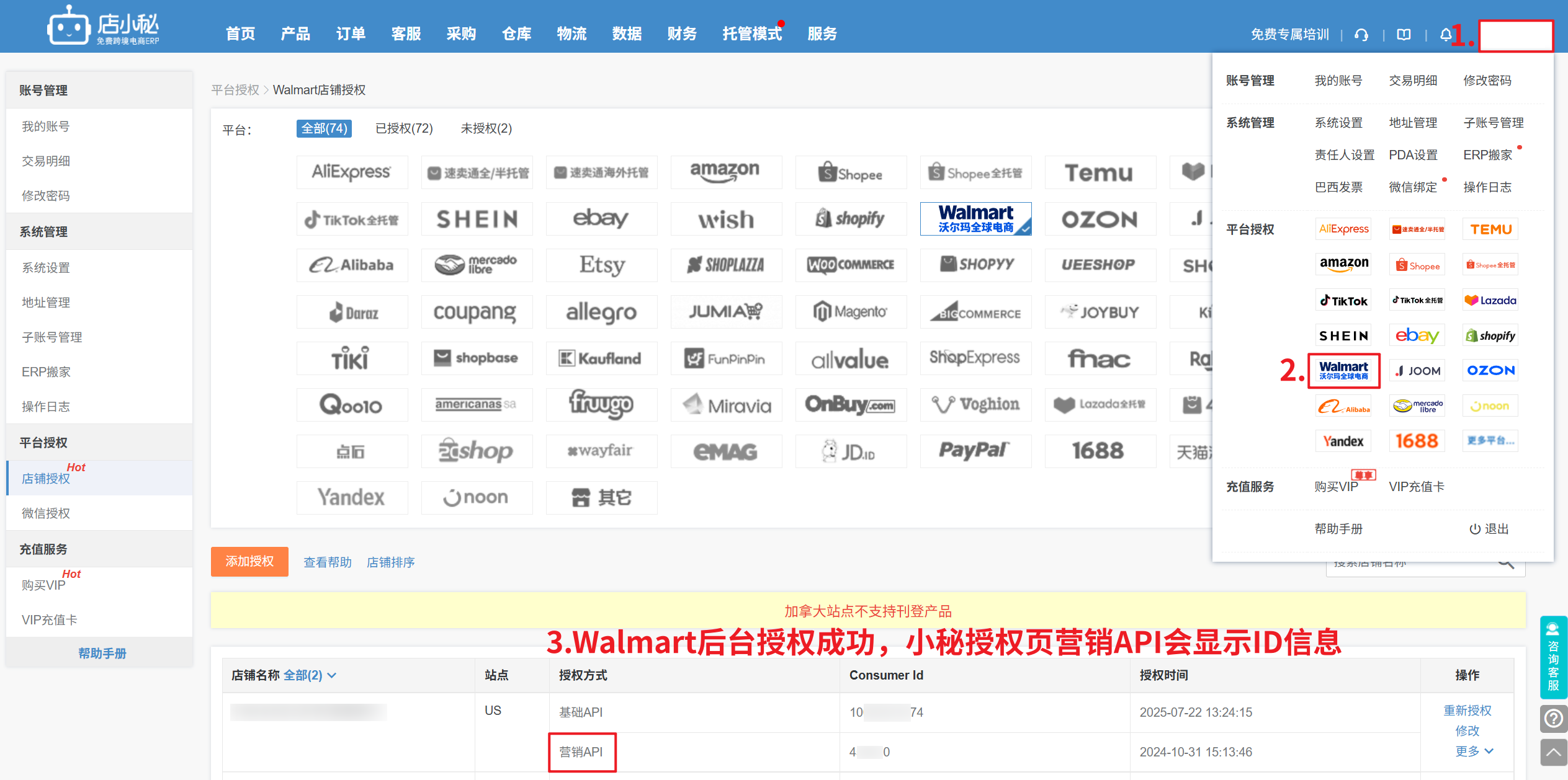 【1】要通过店小秘创建Walmart广告,需要到Walmart店铺后台开启营销API