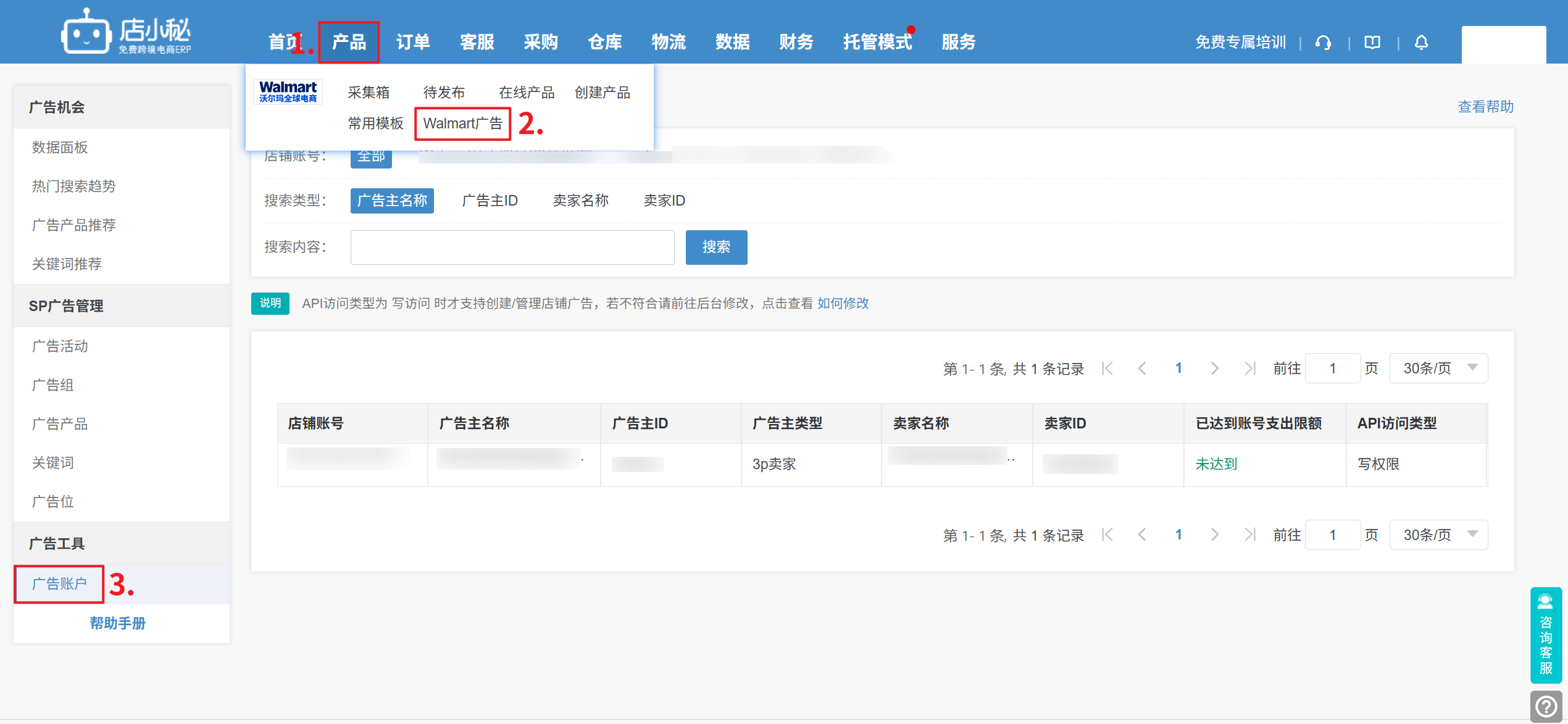 Walmart广告授权成功之后,可以在店小秘查看和创建广告,具体流程可参考:Walmart广告