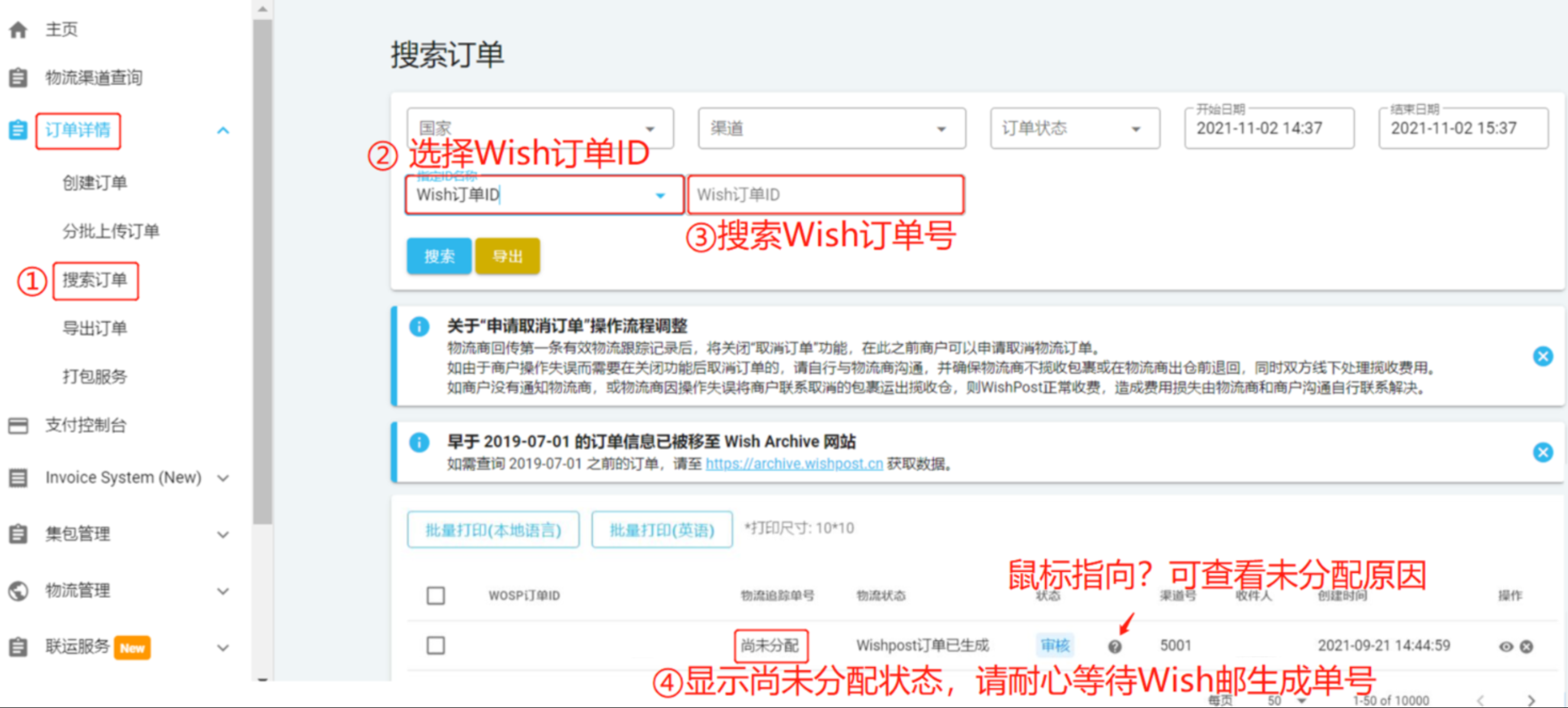 2、到【Wish邮后台—订单明细—搜索Wish订单号】,查看物流单号申请进度: