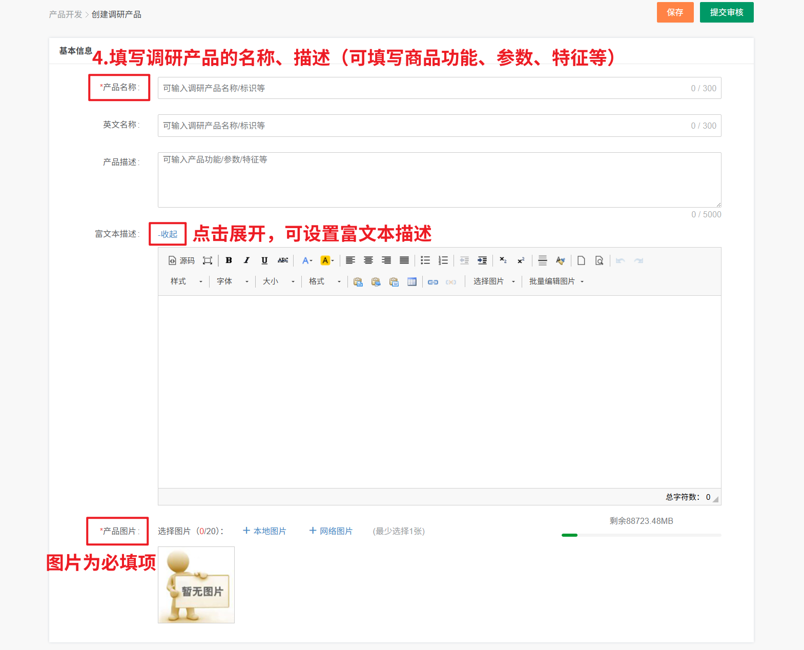 第一步:【产品—产品开发—创建调研商品—填写调研信息—保存】