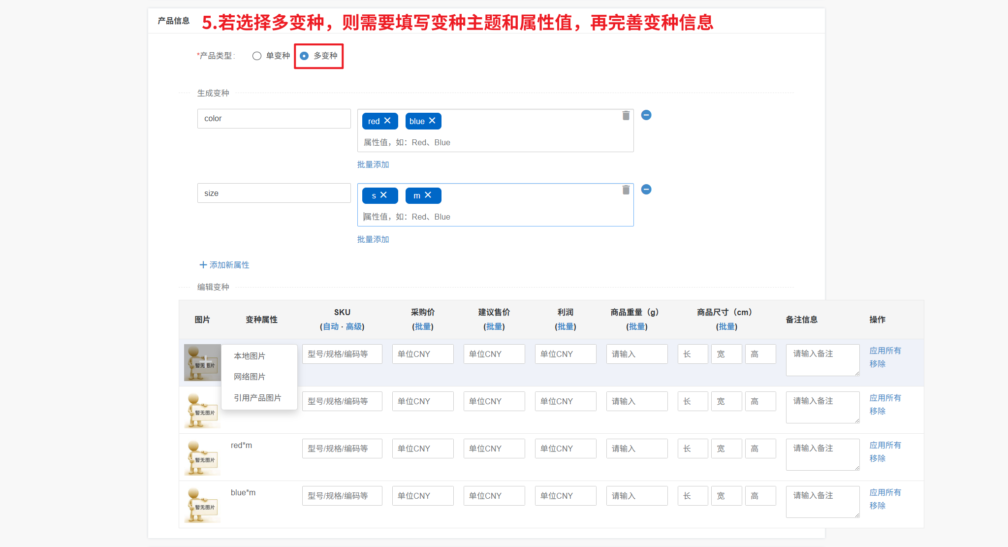 【1】多变种产品,变种主题最多添加5个,变种总数量最多添加200个