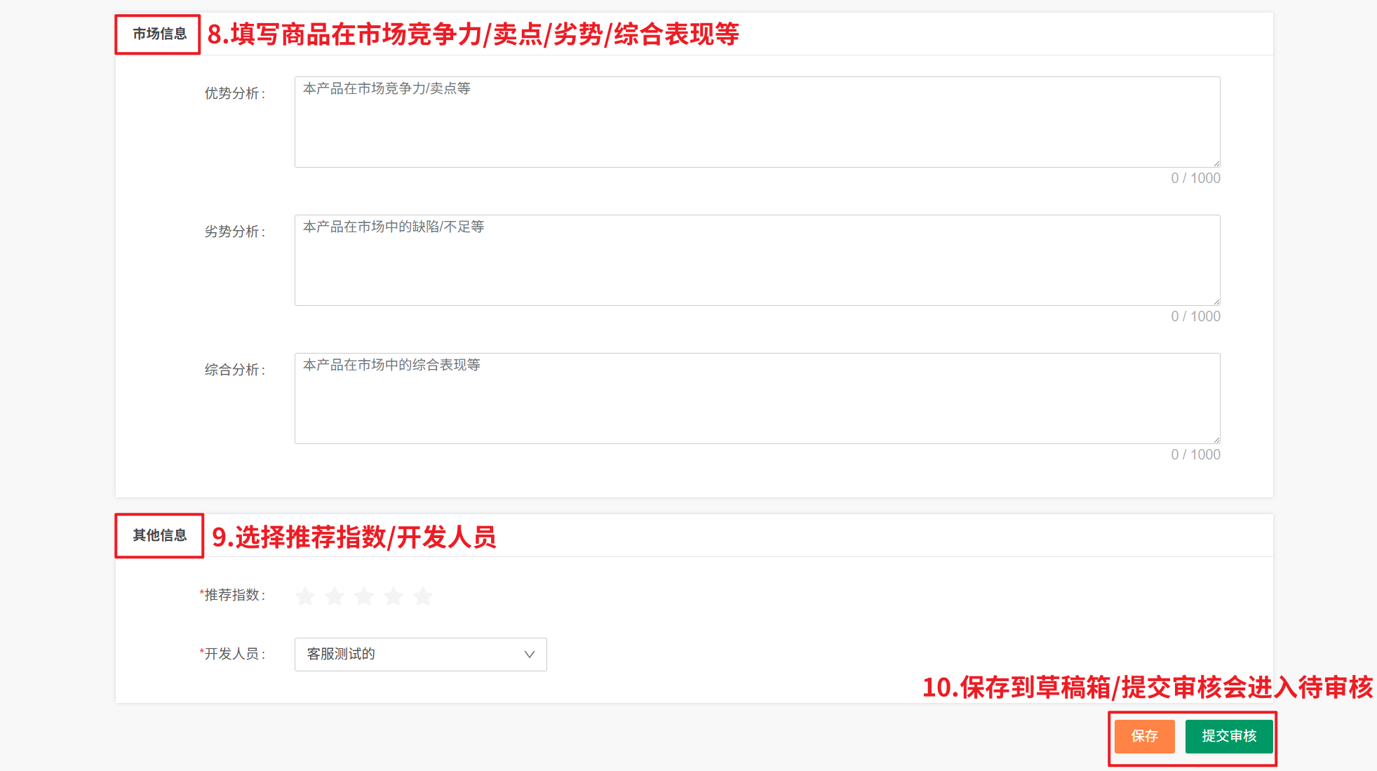 第二步:【进入商品开发草稿箱—点击提交审核—将调研信息提交到待审核】
