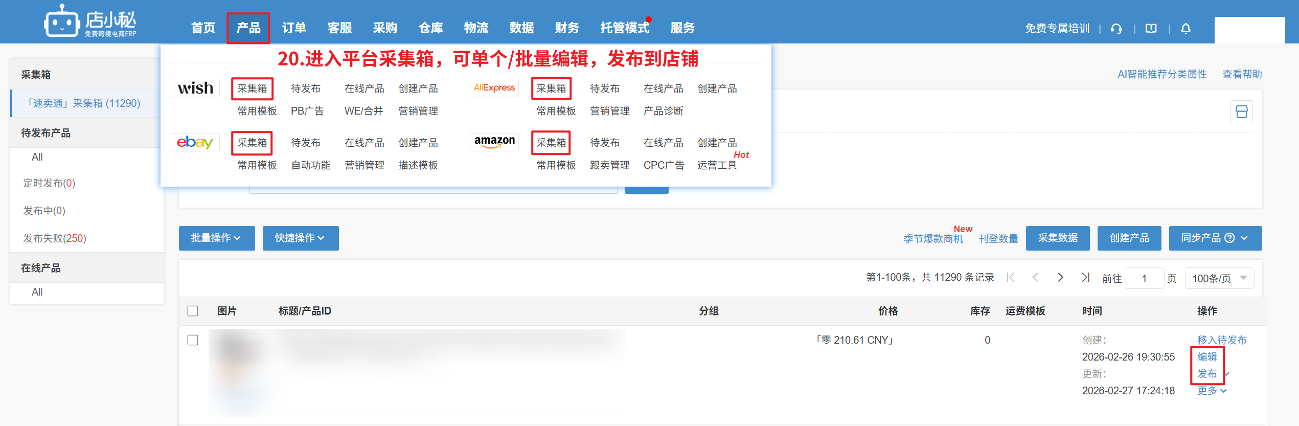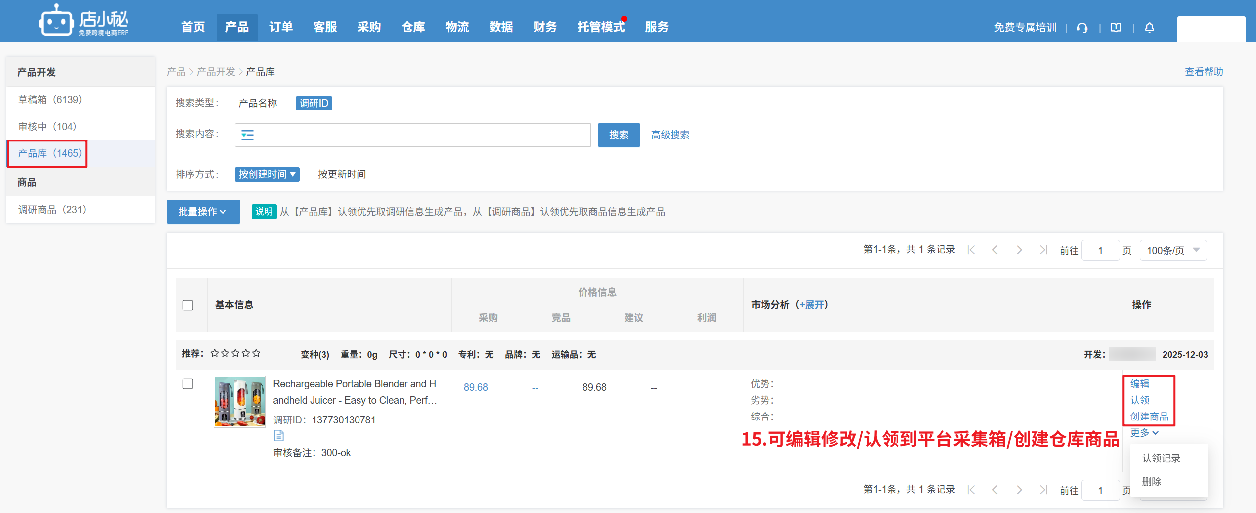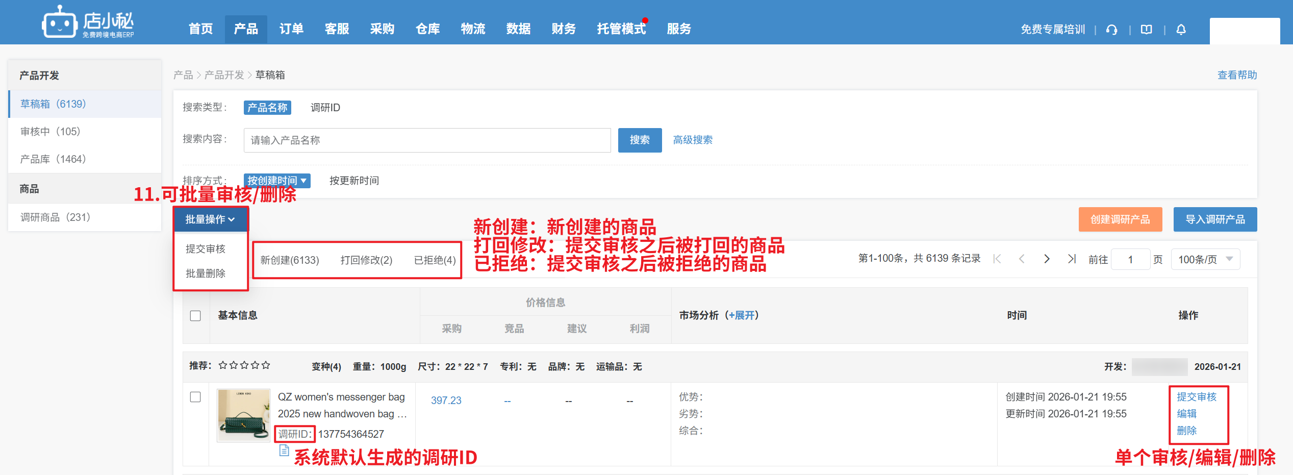 定义: 通过店小秘系统完成商品调研报告、商品审核,生成仓库商品SKU,也可以发布到平台店铺