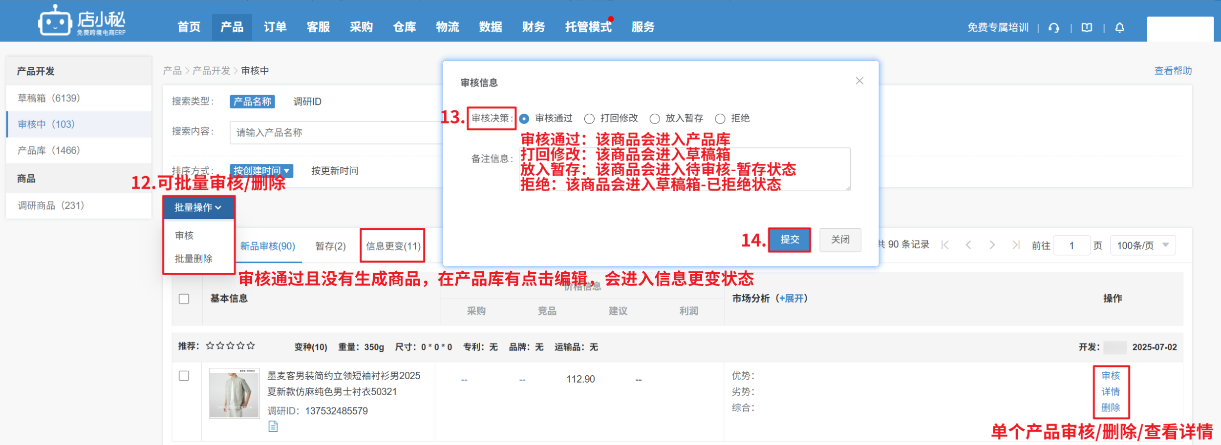 第三步:【审核中的商品可以通过审核、驳回、放入暂存、拒绝等操作—通过后,调研信息进入产品库】