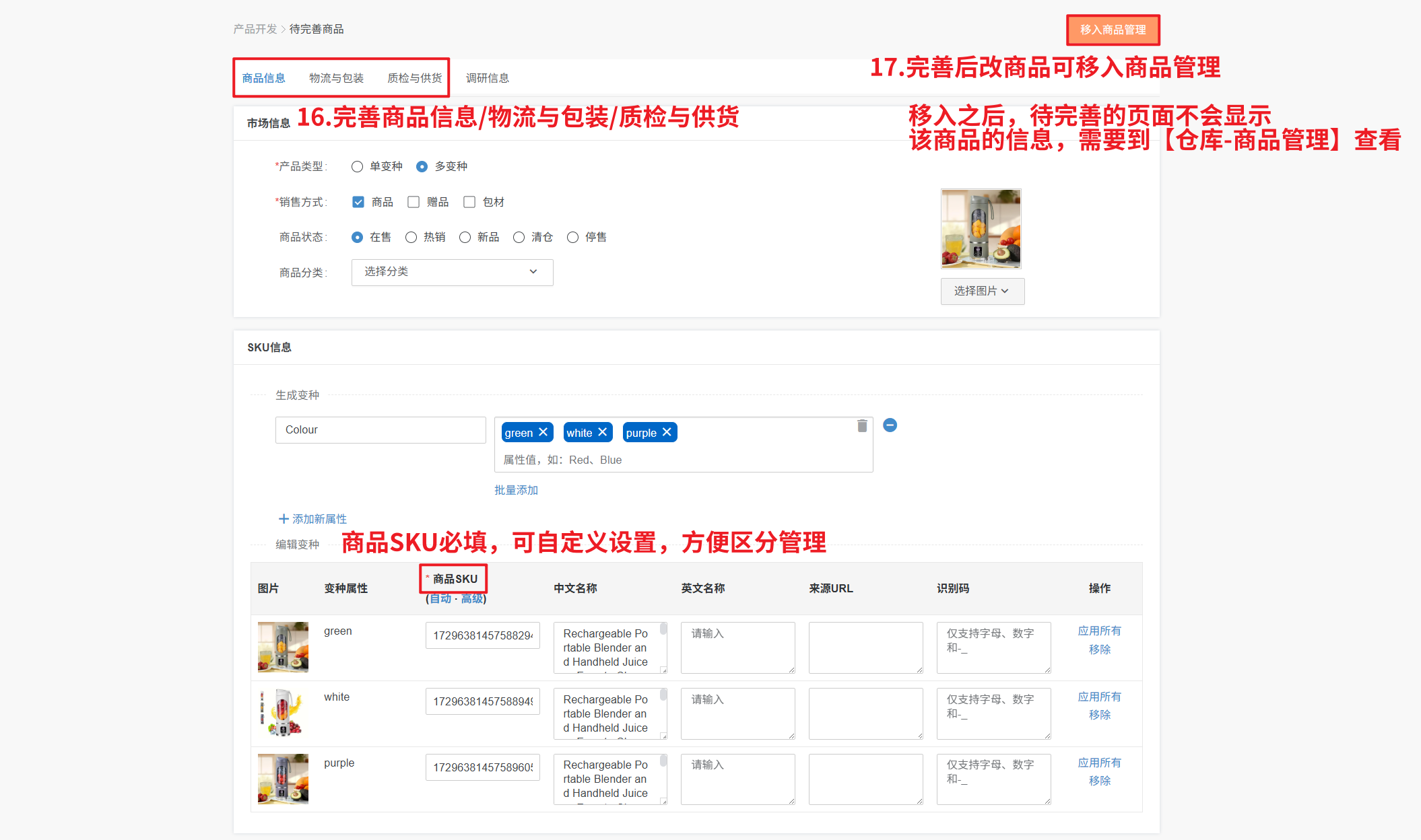 第四步:【产品库—点击创建商品—完善商品信息—移入商品管理】