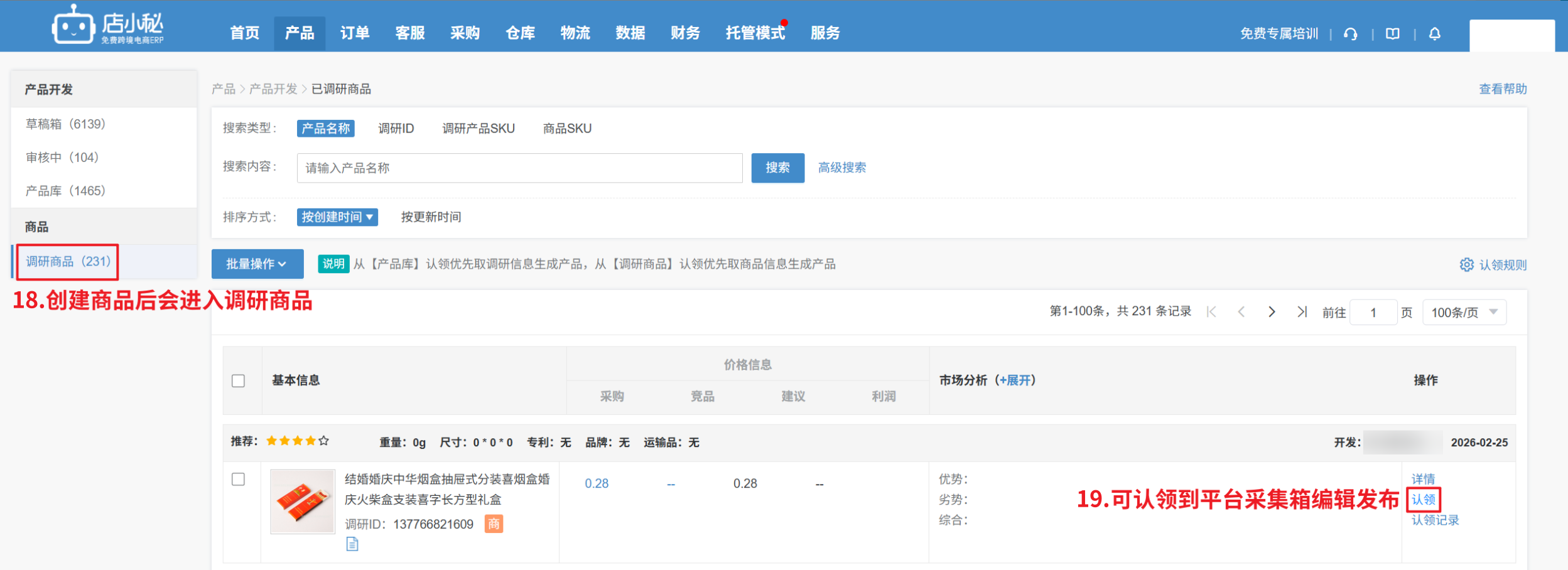 第五步:【有调研信息且移入商品管理中的商品SKU会进入调研商品,进入调研商品,认领到平台采集箱,可到平台采集箱编辑发布】