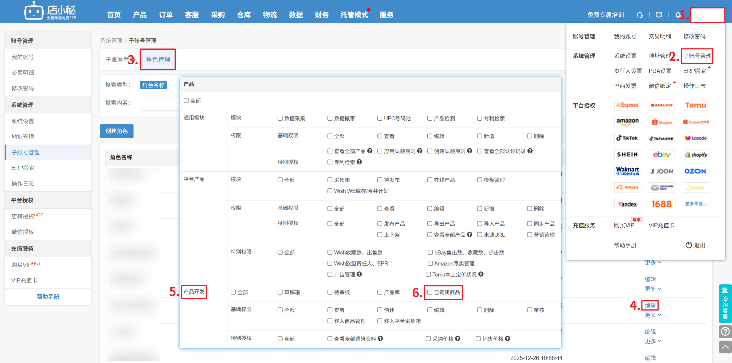 A1:产品开发每个状态都能单独设置权限,【登录店小秘主账号—用户名—子账号管理—角色管理—编辑—勾选已调研商品】