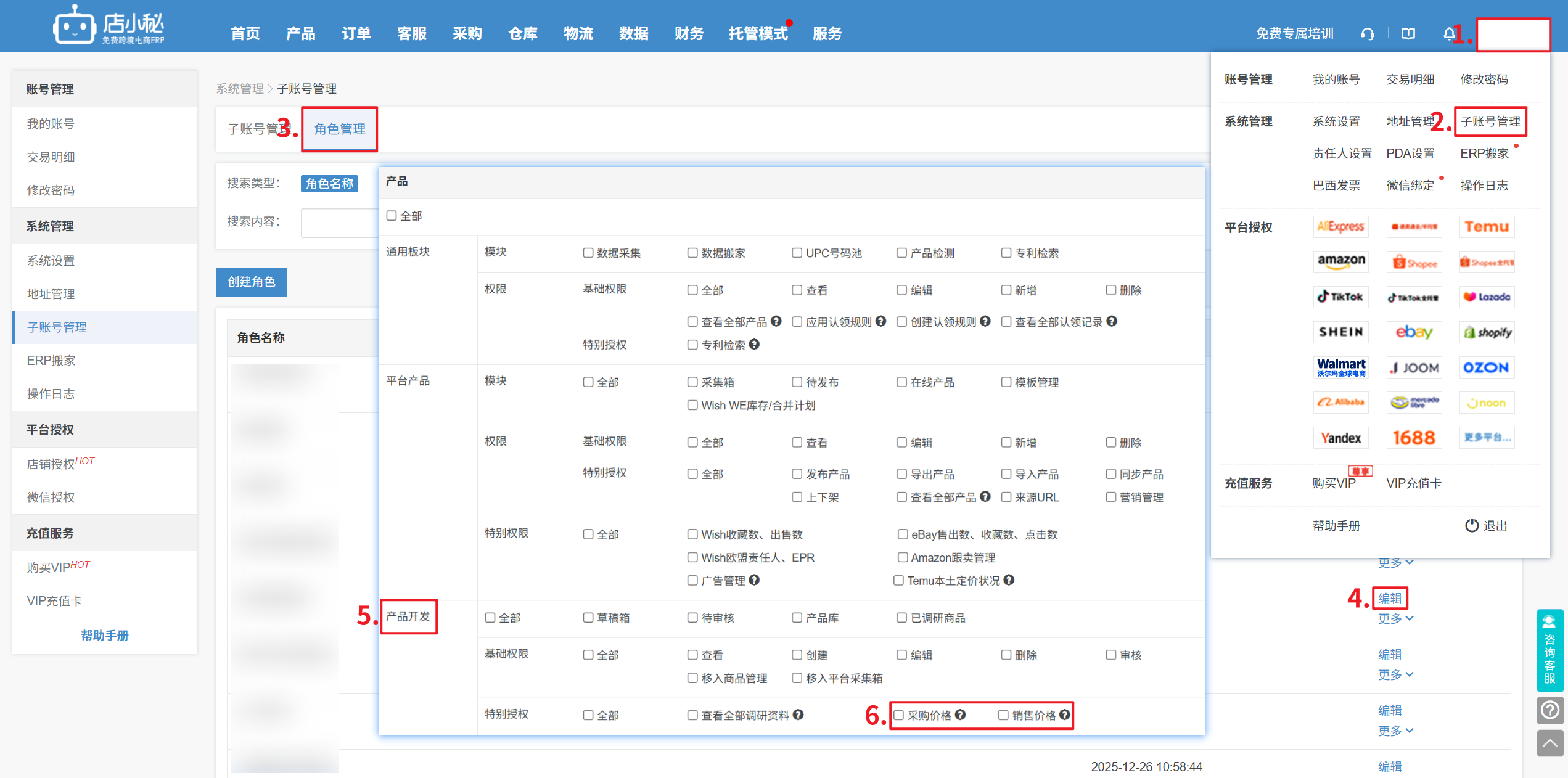 A3:【登录店小秘主账号—用户名—子账号管理—角色管理—点击编辑—产品开发—采购/销售价格勾选上即可】