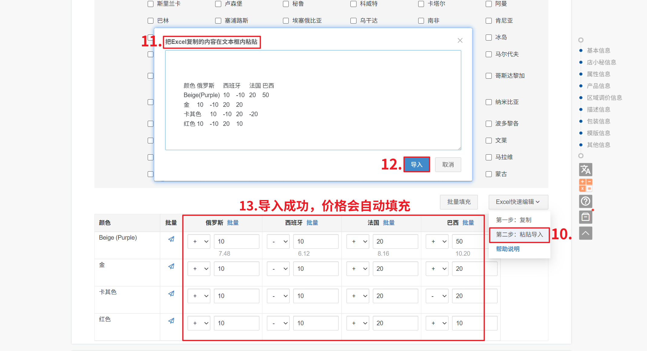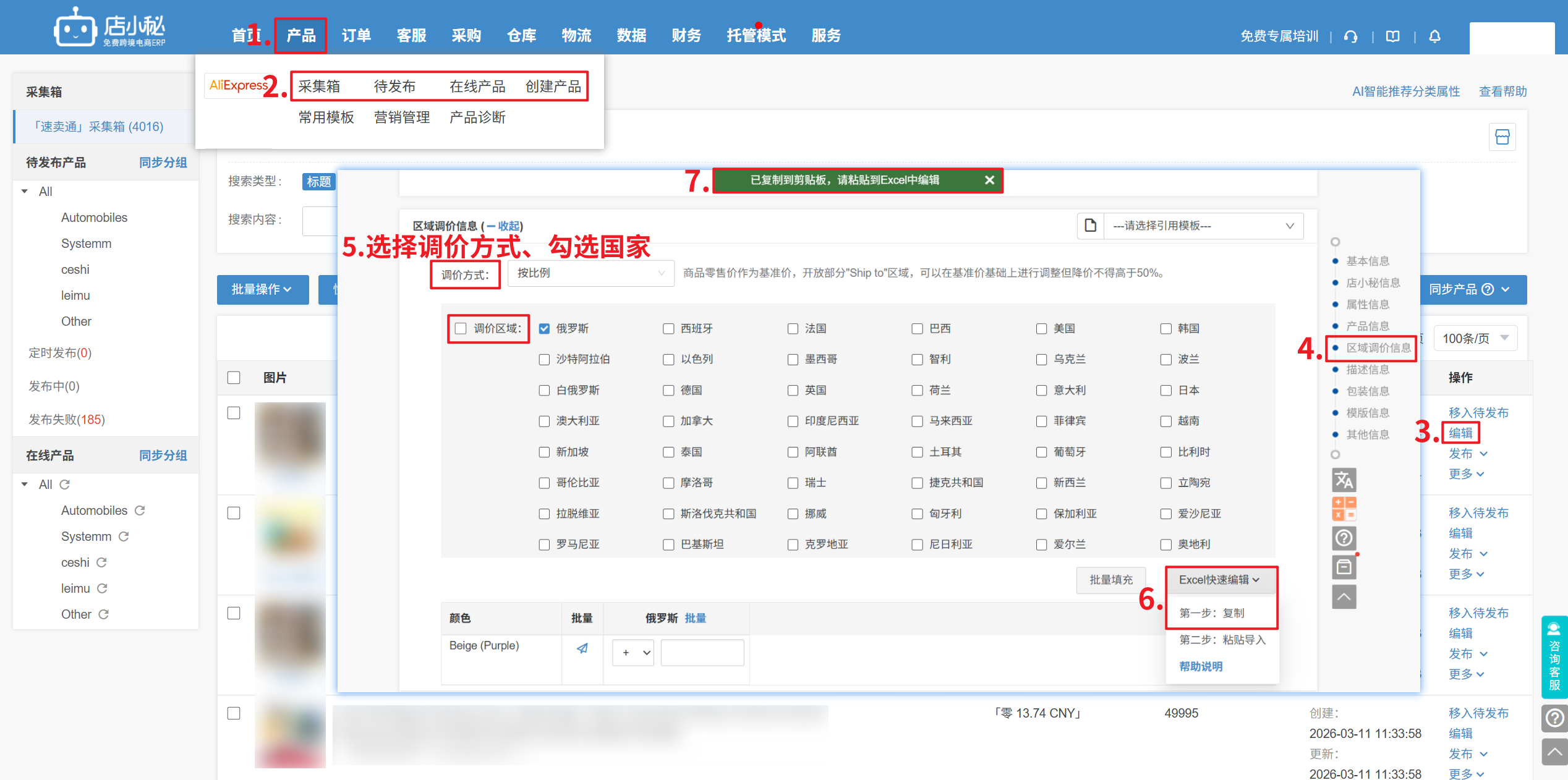 第一步:【产品—采集箱/待发布/在线产品/创建产品—编辑—区域调价—选择国家—Excel快速编辑—复制】