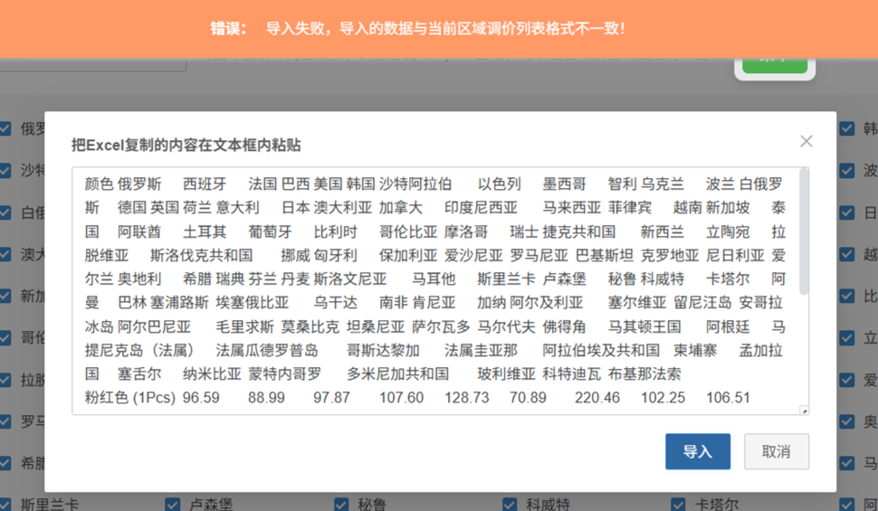 Q1:速卖通区域调价导入失败:导入的数据与 当前区域调价列表格式不一致!