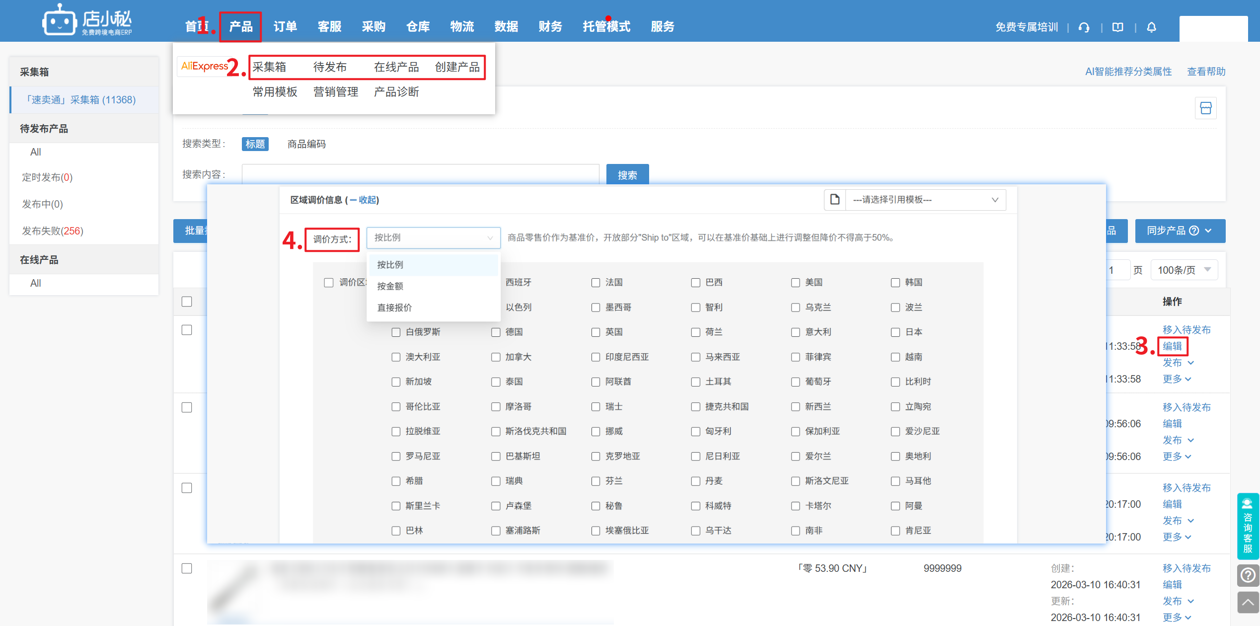 ①【产品—采集箱/待发布/在线产品/创建产品—产品编辑页—区域调价信息—选择调价方式—选择国家】