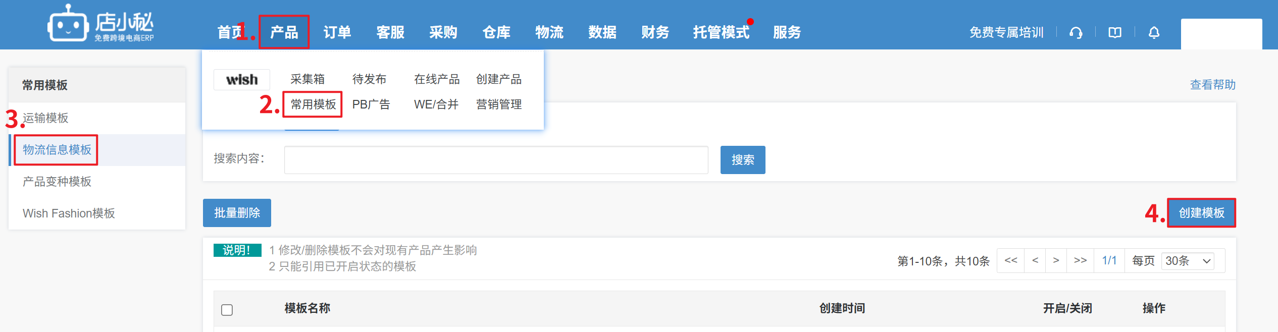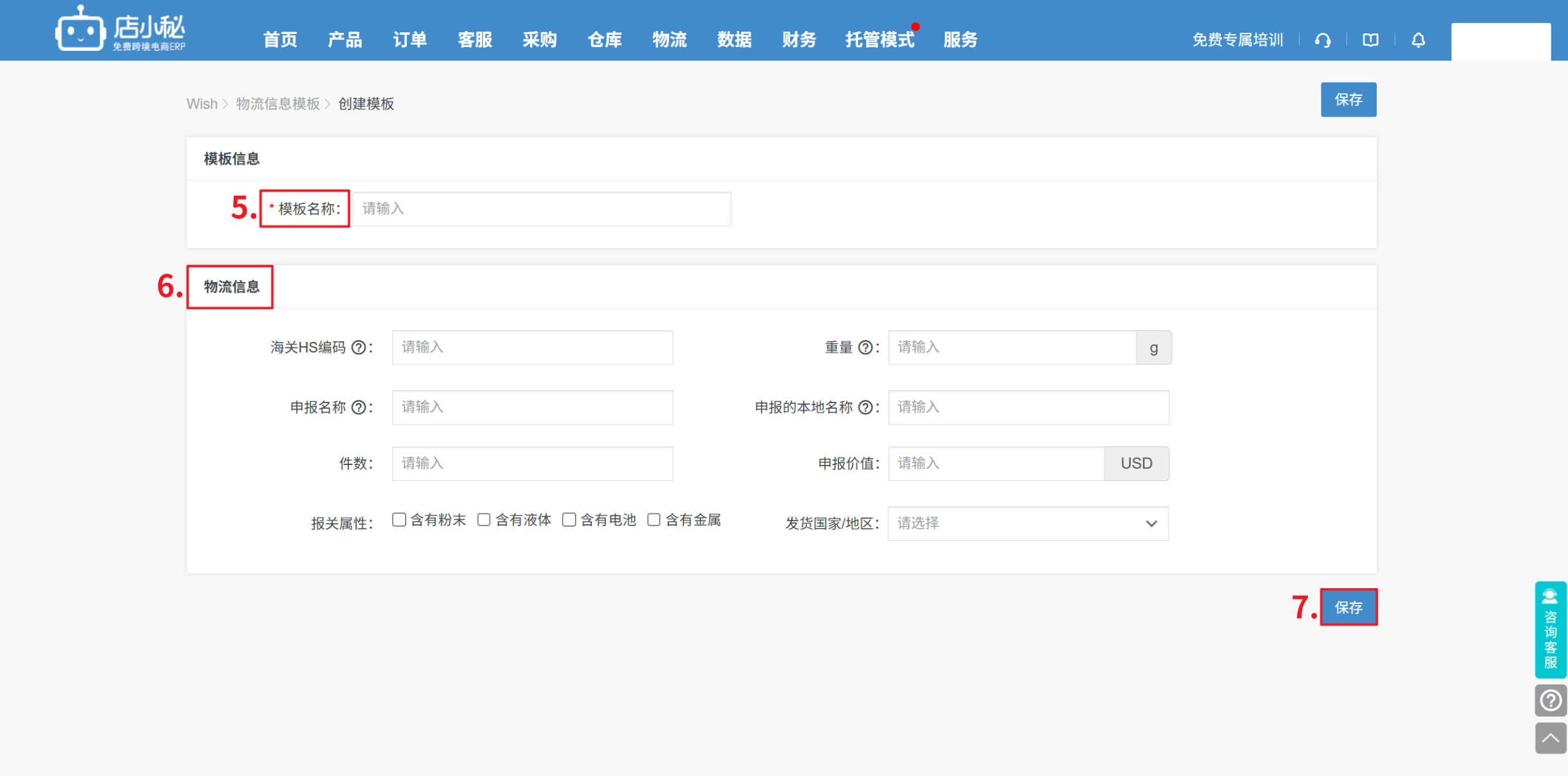 【产品—常用模板—物流信息模板—创建模板—自定义模板名称,完善物流信息—保存】