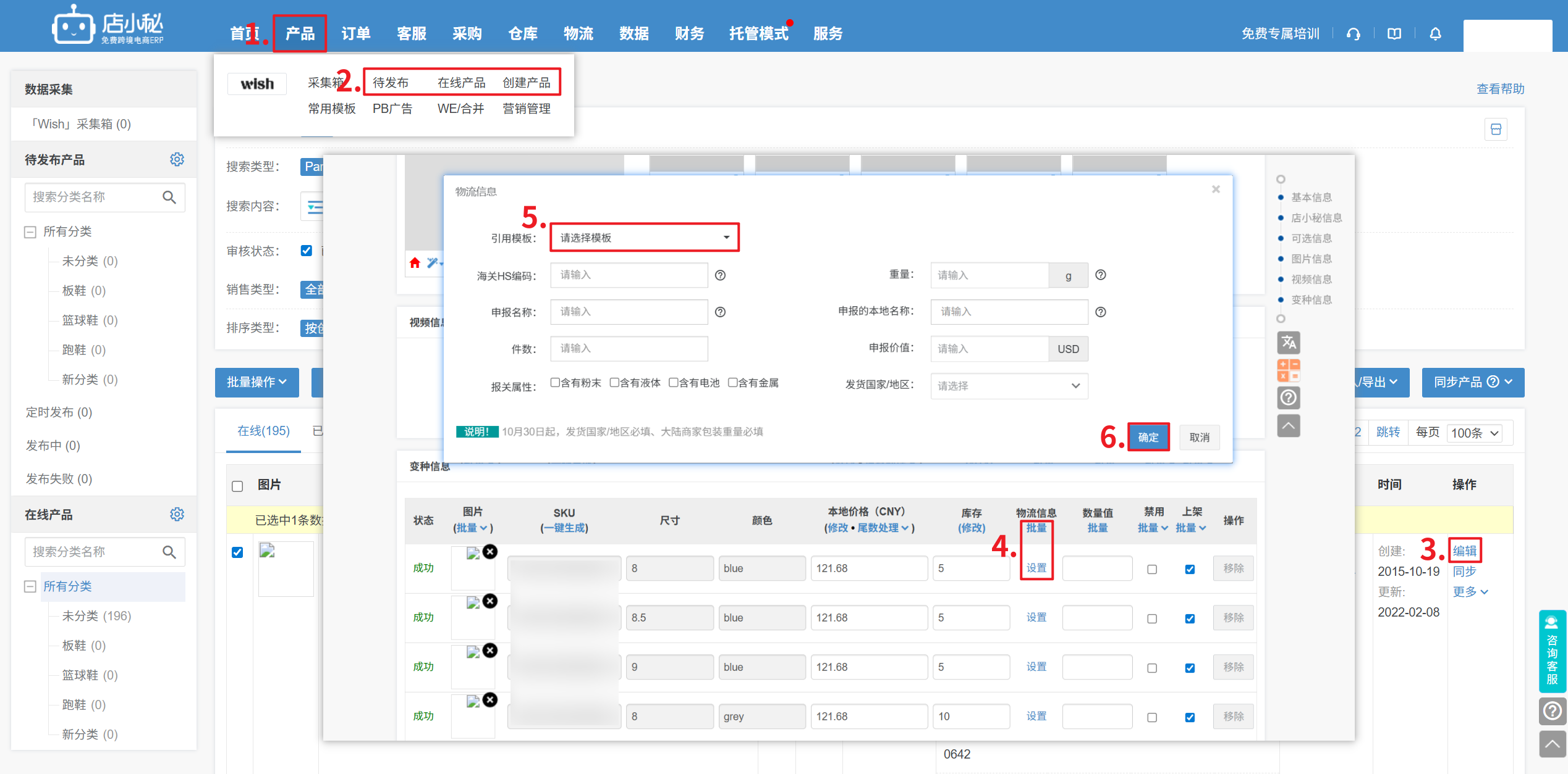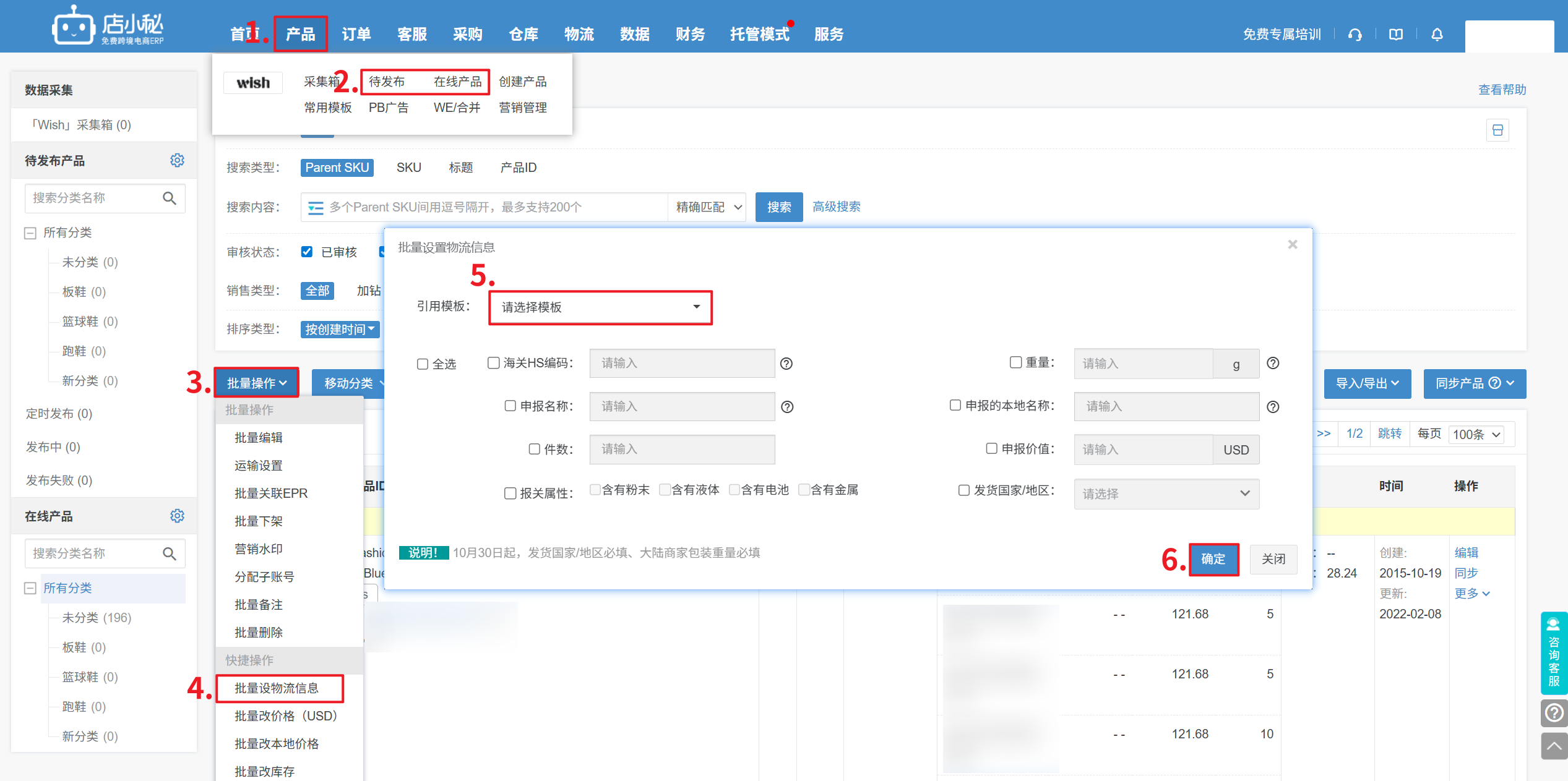 【产品—待发布/在线产品—勾选产品—批量操作—批量设物流信息—选择模板—确定】
