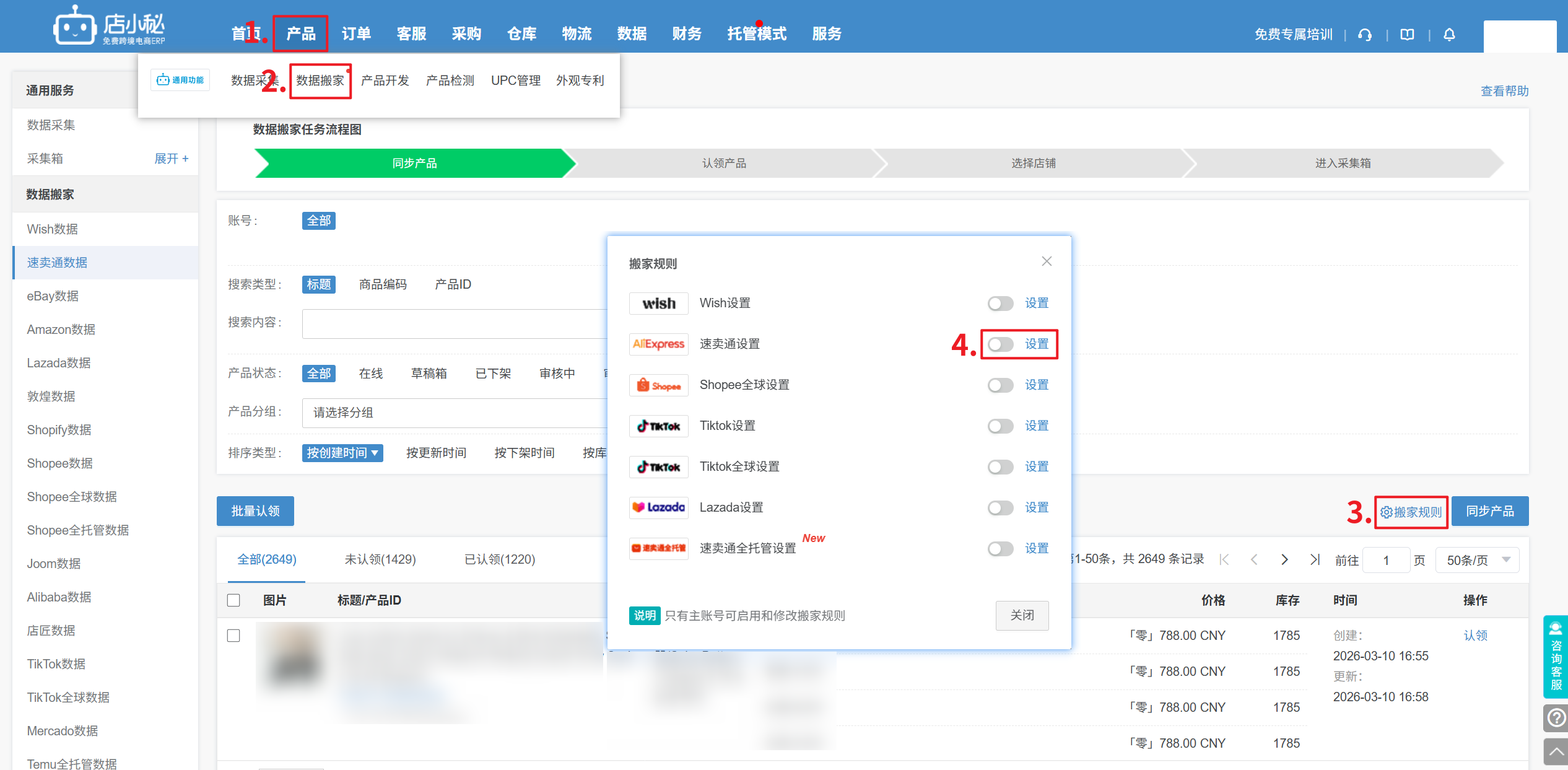 第一步:【产品—数据搬家—搬家规则—速卖通—点击设置】