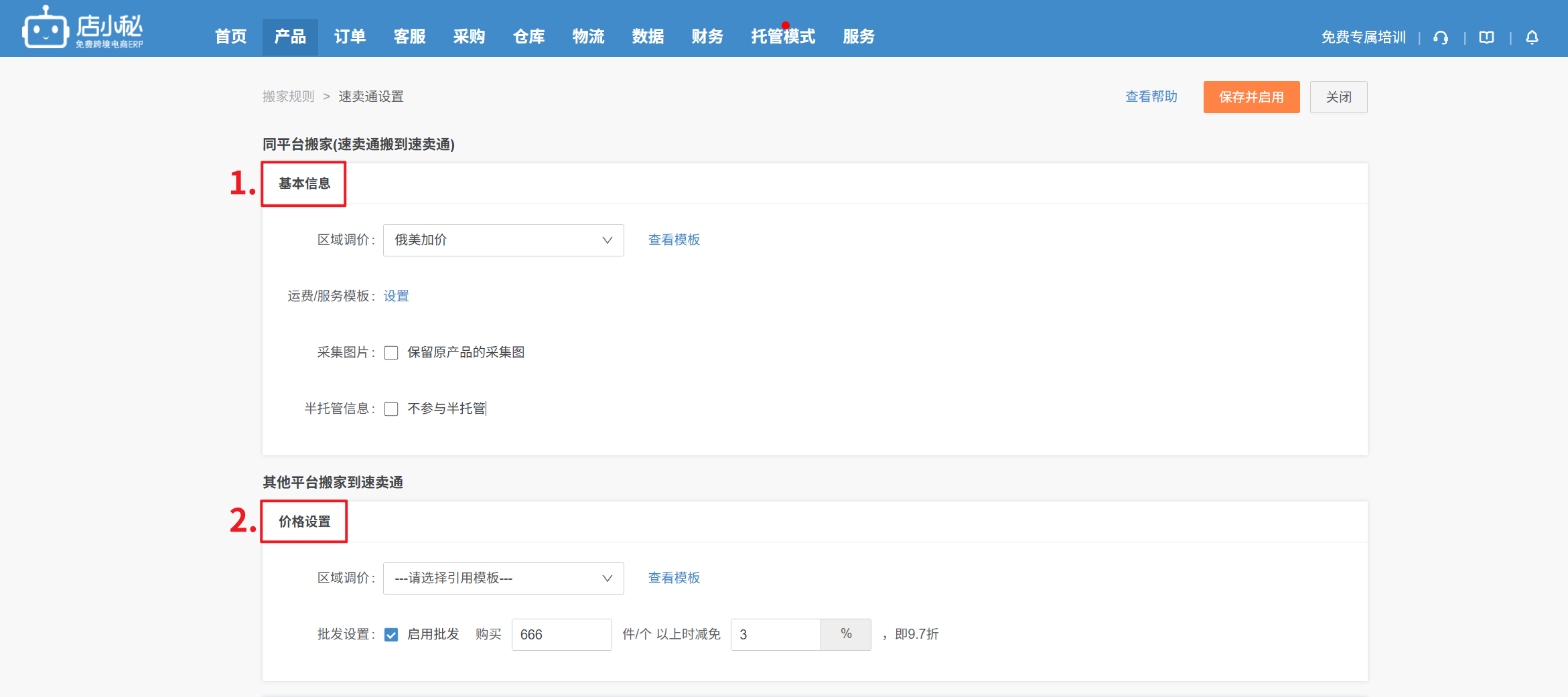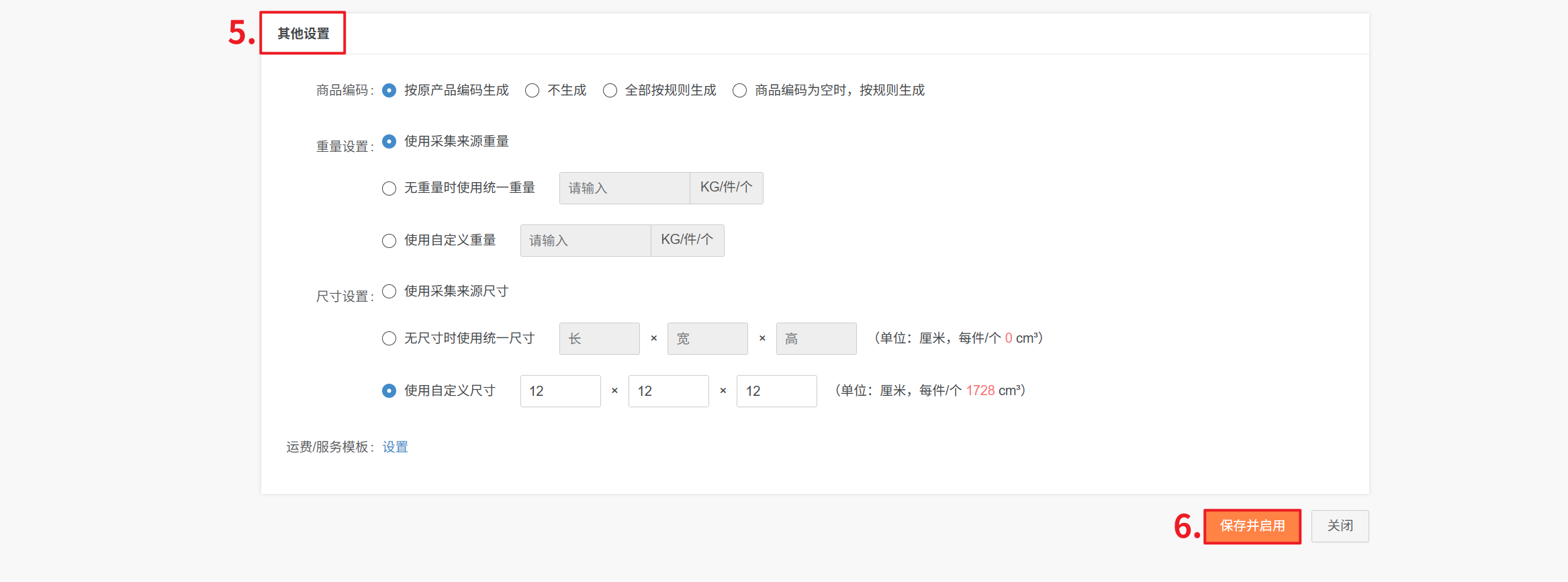 6、保存并启用:设置规则后,点击保存并启用,产品搬家认领到速卖通采集箱时,会根据规则自动对应