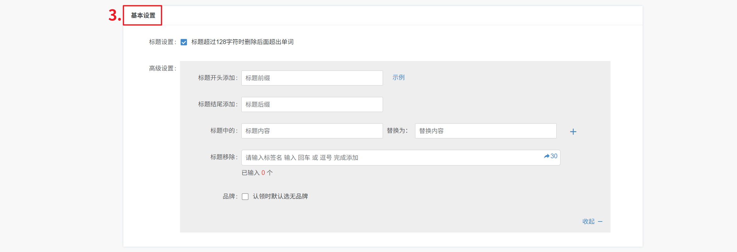 标题设置:自定义勾选当标题超过128字符时,自动删除后面超出单词