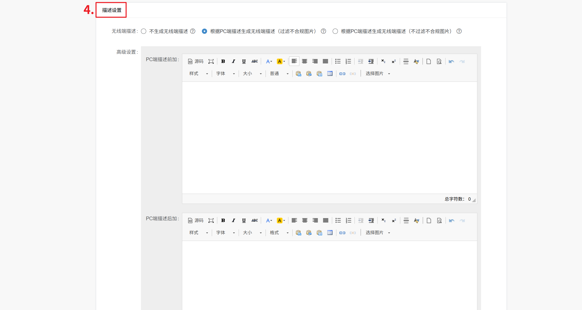 无线端描述:可自定义勾选是否根据PC端描述生成无线端描述