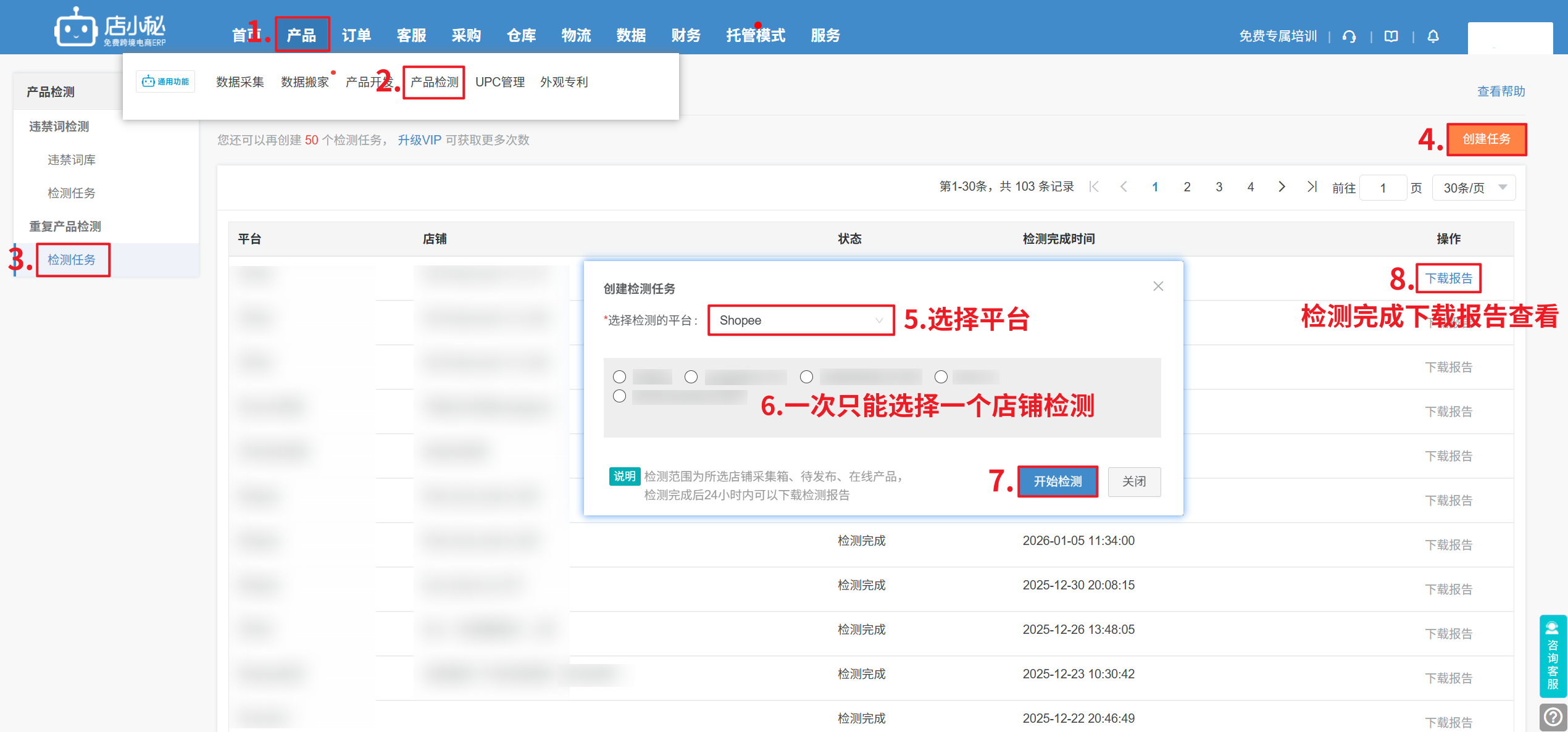 第一步:【产品—产品检测—重复产品检测—检测任务—创建任务—选择平台/店铺—开始检测—检测完成下载报告查看】