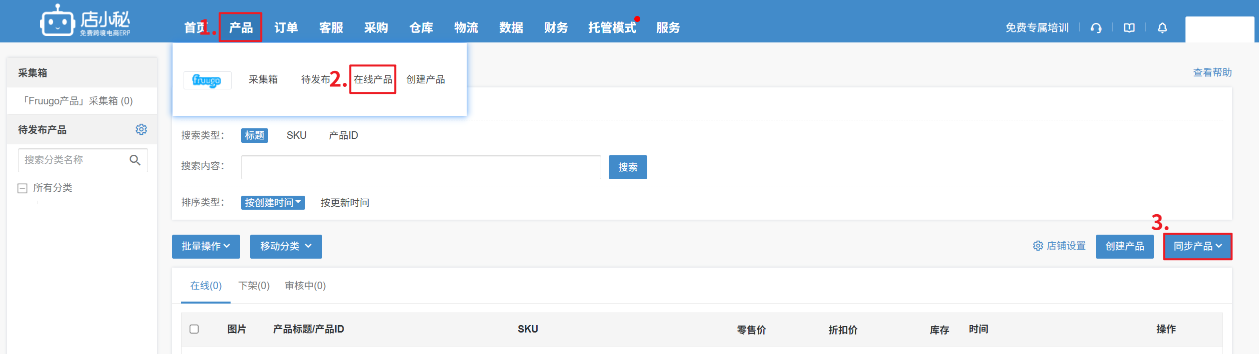 同步全部产品:可从Fruugo后台同步最新状态的产品到店小秘